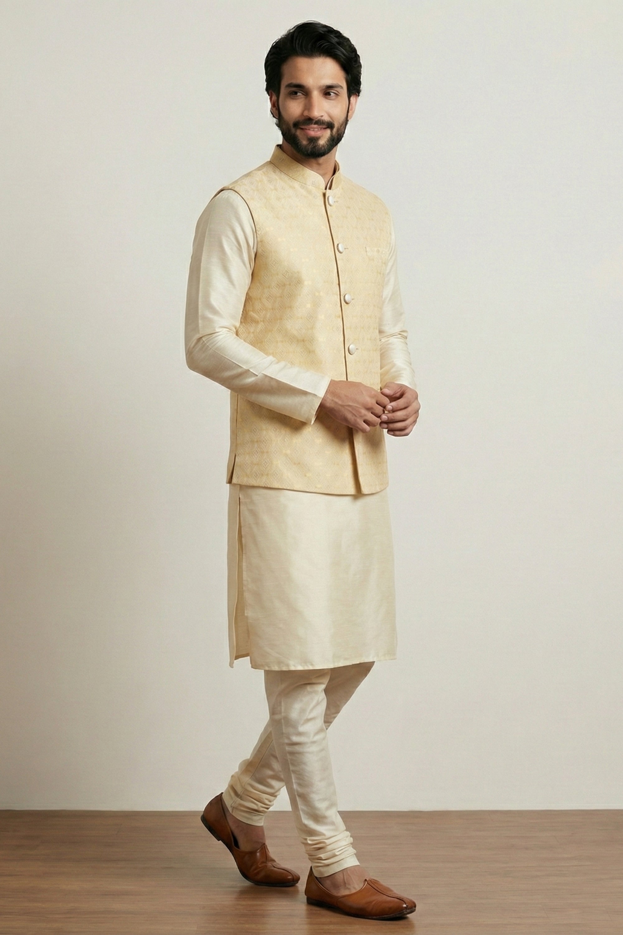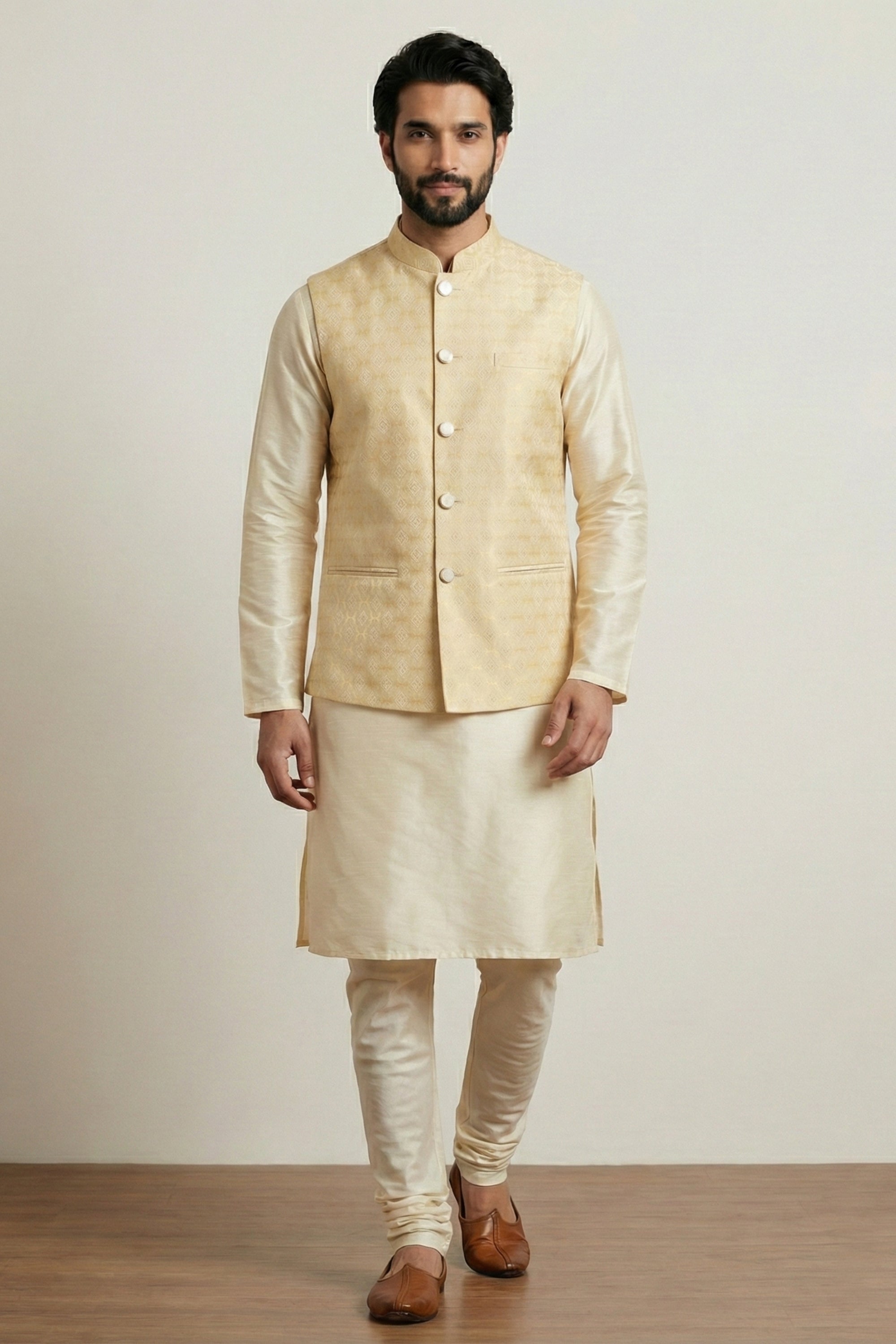 Step into timeless elegance with this Amazing Gold Jacquard Silk Jacket with Banarasi Dhupion Kurta Pyjama Set for Men, designed to make a powerful style statement at weddings and festive occasions. This premium ethnic ensemble combines rich textures, luxurious fabric, and modern tailoring for a sophisticated traditional look. The Mustard Gold Jacquard Silk Jacket features intricate woven patterns that enhance its royal appeal and add depth to the overall design. Its structured silhouette, elegant buttons, and refined finish create a polished and distinguished appearance. Paired with a Gold Banarasi Dhupion Kurta, crafted from high-quality fabric with a smooth sheen and lightweight comfort, this outfit offers the perfect balance of tradition and contemporary style. The matching pajama completes the coordinated look with effortless grace.