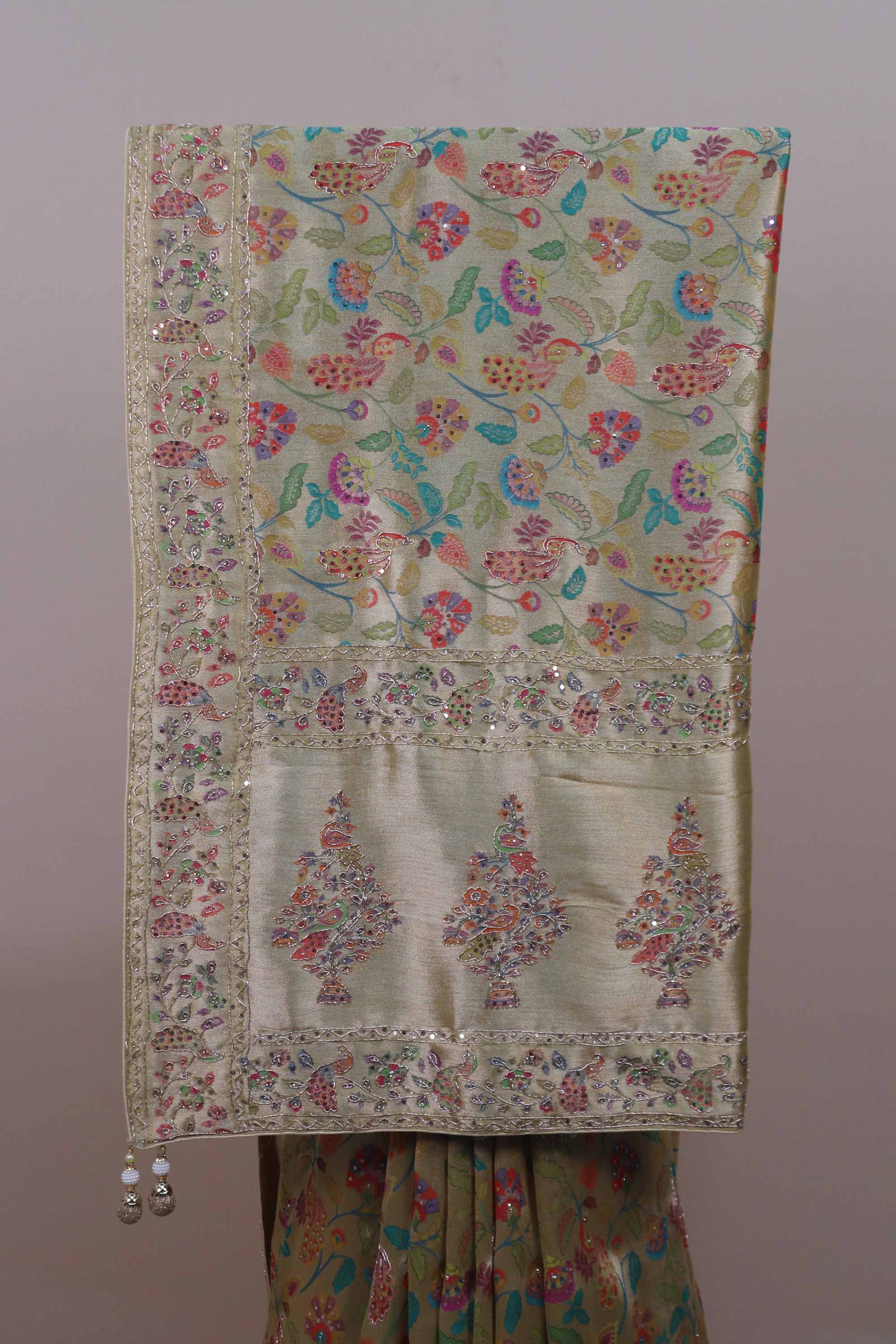 Beige Gold Designer Parsi Gara Embroidered Saree Floral Motifs