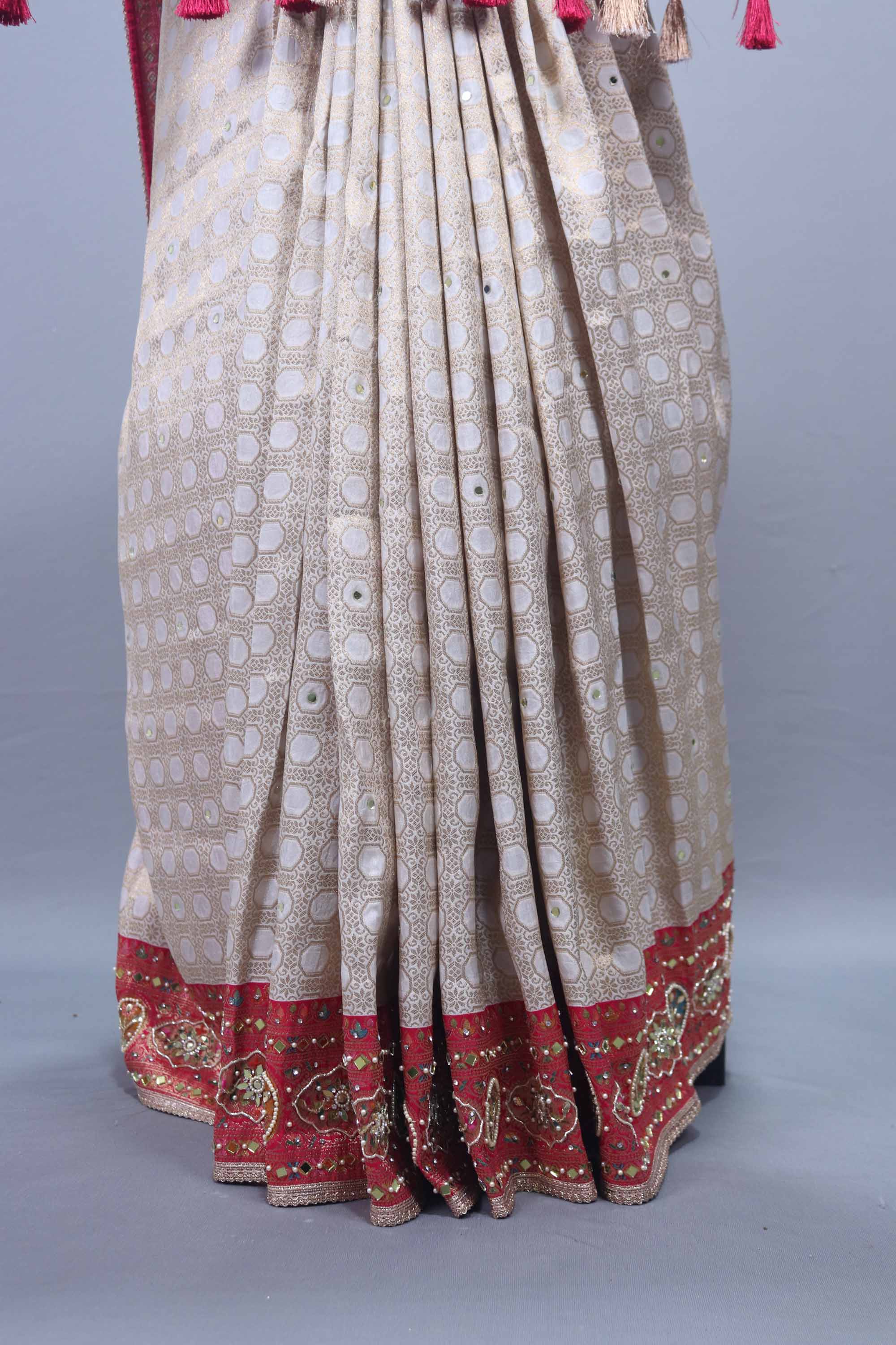 Enhance your ethnic elegance with this stunning Beige Red Designer Silk Saree with Heavy Pallu Festive Wear, crafted to reflect rich tradition and royal charm. The saree features a beautifully patterned body with subtle woven motifs, perfectly complemented by a heavily embroidered red border adorned with intricate zari, sequin, and stone work. The highlight of this saree is its ornate pallu, showcasing detailed traditional arch and floral designs finished with elegant tassel detailing, adding a festive and luxurious touch. The harmonious contrast of off-white and deep red makes this saree a timeless choice for special occasions.