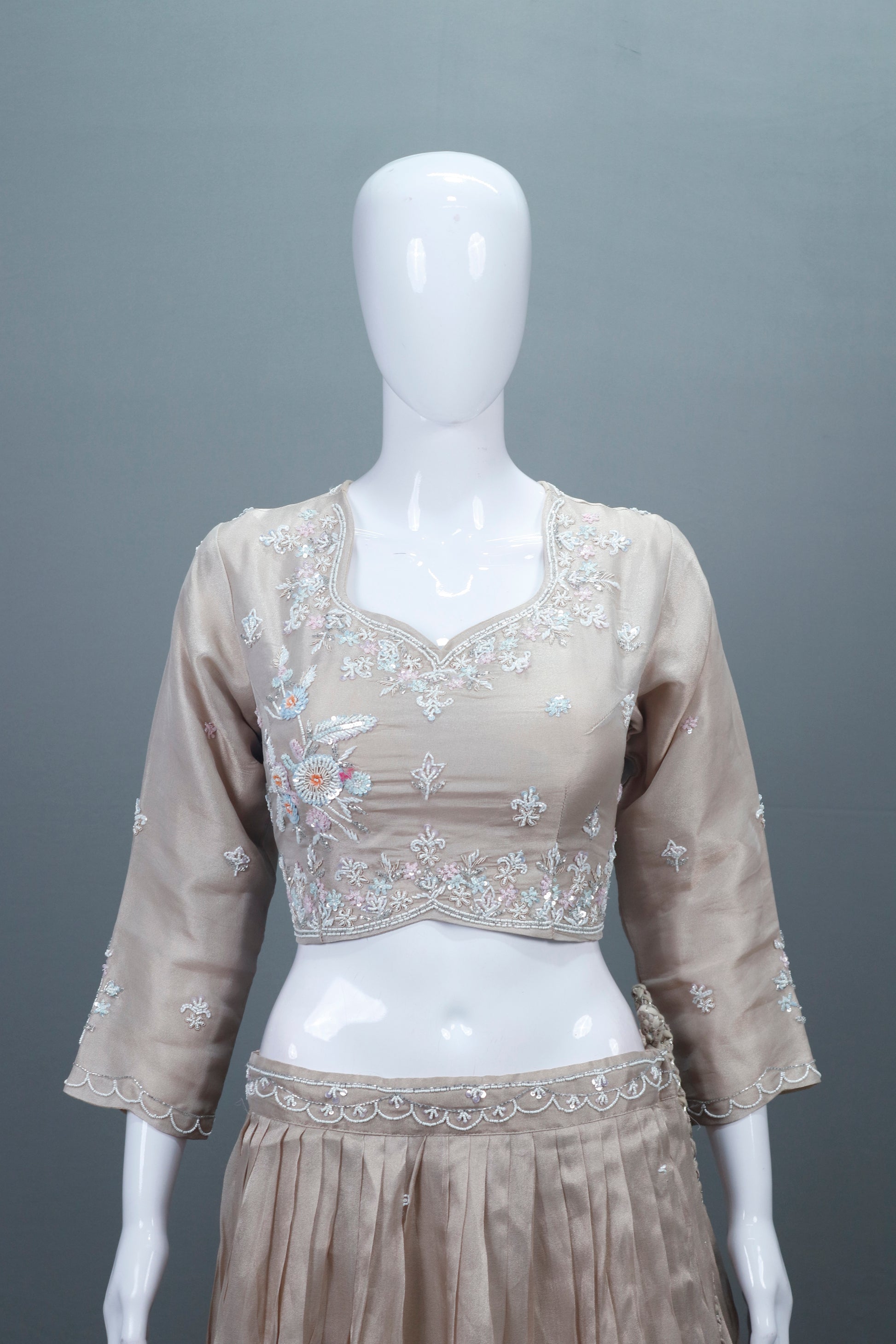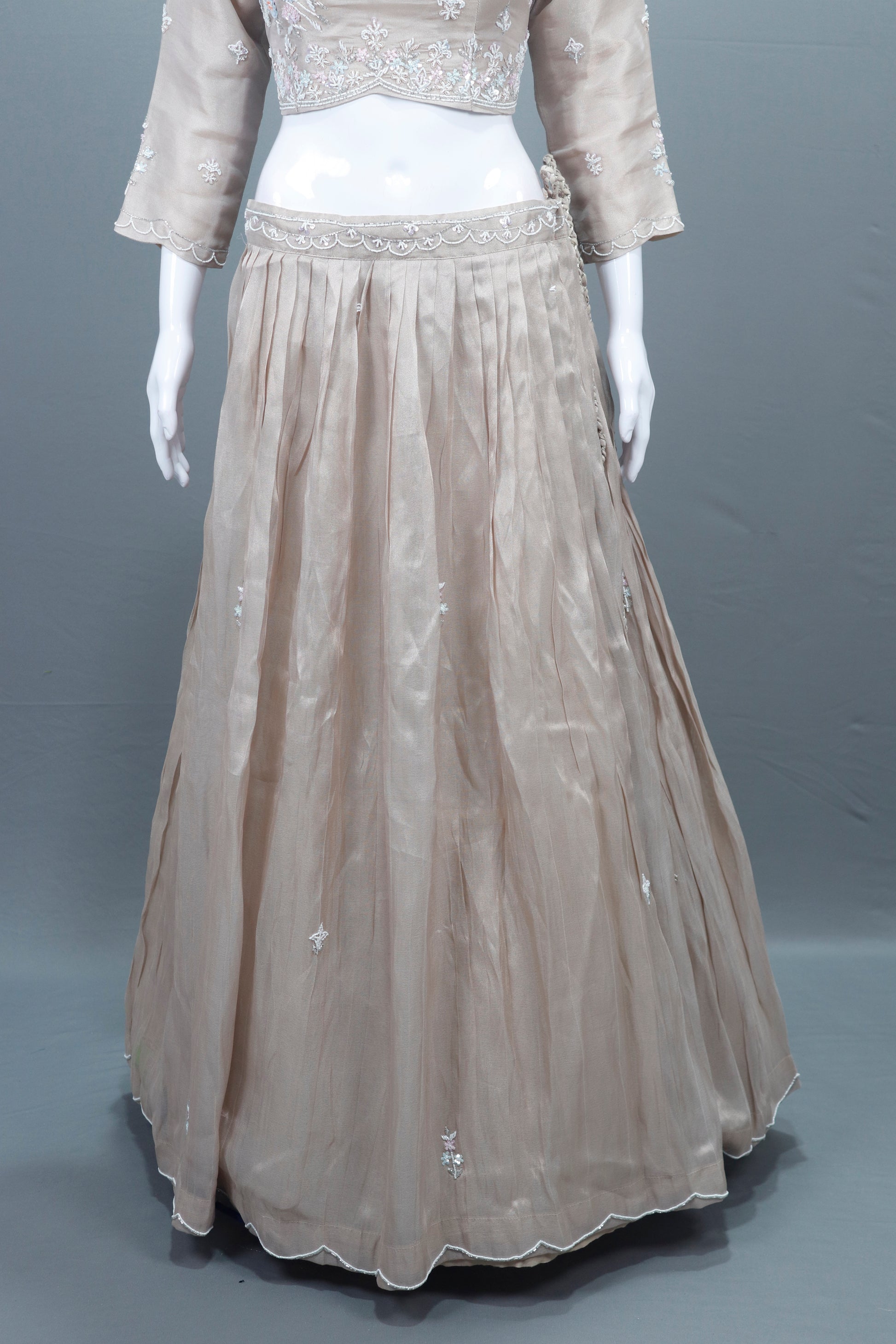 Make a stunning style statement with this Beige Silk Lehenga Choli with Ombre Dupatta Bridal The intricately hand-embroidered blouse is paired with a flared lehenga skirt and a soft ombre dupatta in pink and green tones, finished with scalloped borders for an elegant touch. Crafted from premium silk, this lehenga set is perfect for weddings, engagement ceremonies, festive occasions, and sangeet nights. Pair it with minimal jewelry and heels for a graceful yet contemporary ethnic look.