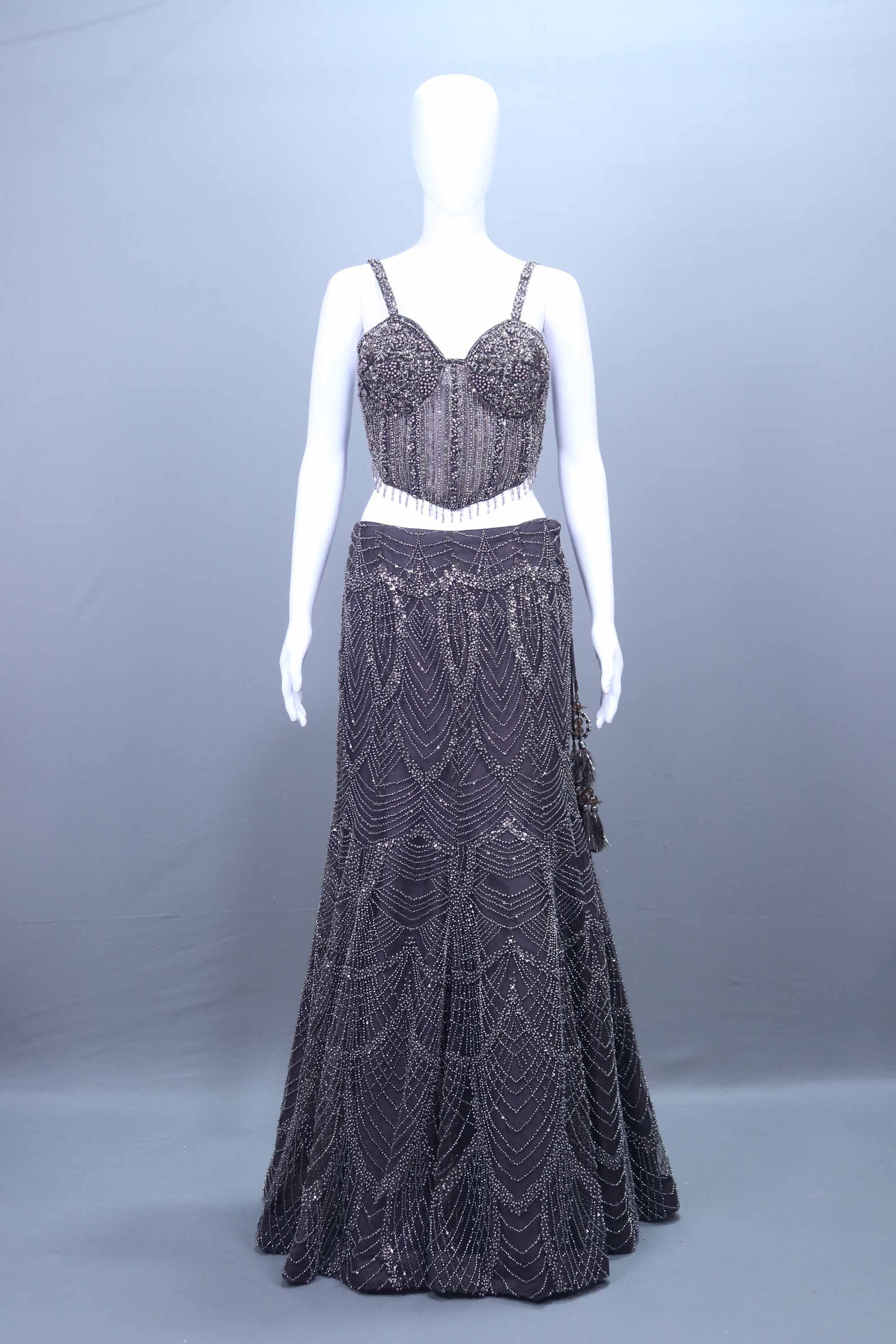 Elevate your festive wardrobe with this Black Heavy Embroidered Designer Lehenga Choli Reception Wear crafted with intricate hand-embroidered detailing that adds a rich, glamorous touch to your look. The embellished blouse features heavy beadwork and sequins arranged in elegant patterns, while the flared lehenga showcases stunning cascading designs that shimmer beautifully with every movement. Perfect for weddings, receptions, sangeet, cocktail parties, and festive celebrations, this outfit blends modern style with traditional craftsmanship making it an irresistible pick for fashion lovers.