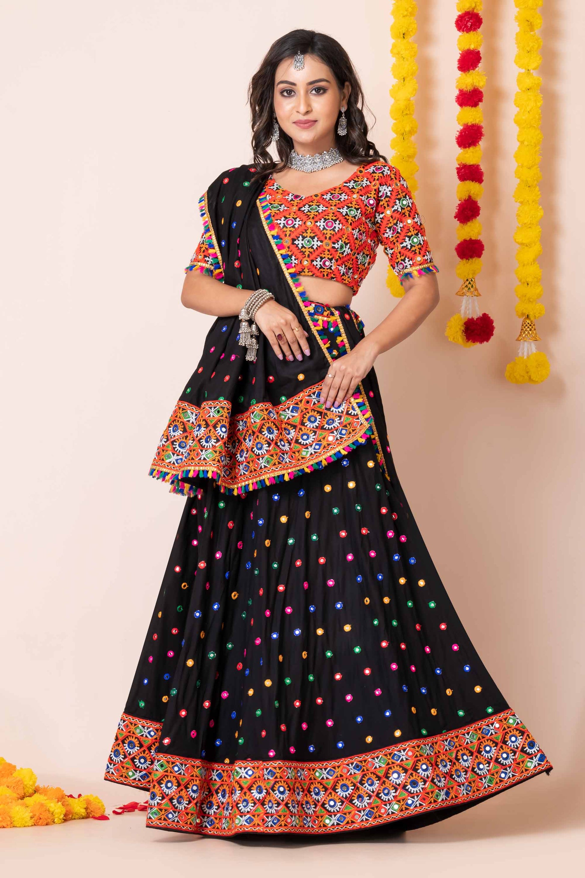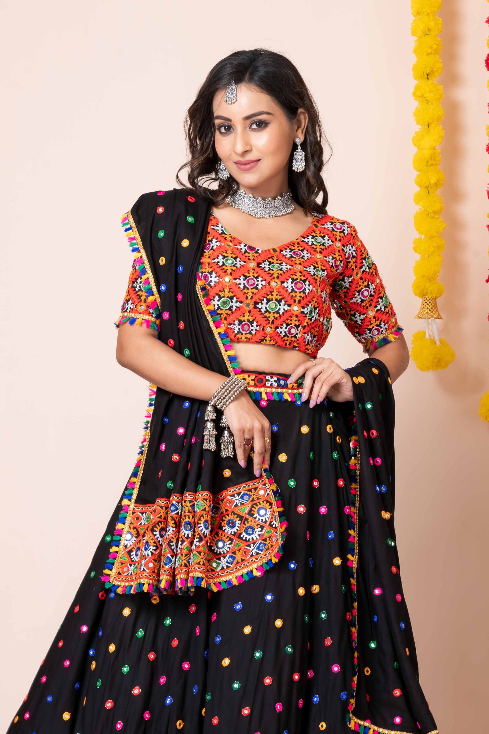 Celebrate the festive season in style with this Black Lehenga Choli for Women, beautifully crafted with multicolor mirror embroidery and traditional Gujarati patterns. The vibrant orange blouse features intricate mirror and thread work, paired with a flared black lehenga adorned with colorful mirror embellishments and embroidered borders. The matching dupatta with tassel detailing completes the ethnic look, making it a perfect outfit for Garba nights, Dandiya events, weddings, and festive celebrations. Designed in breathable fabric, this lehenga choli offers both comfort and elegance for long festive evenings.