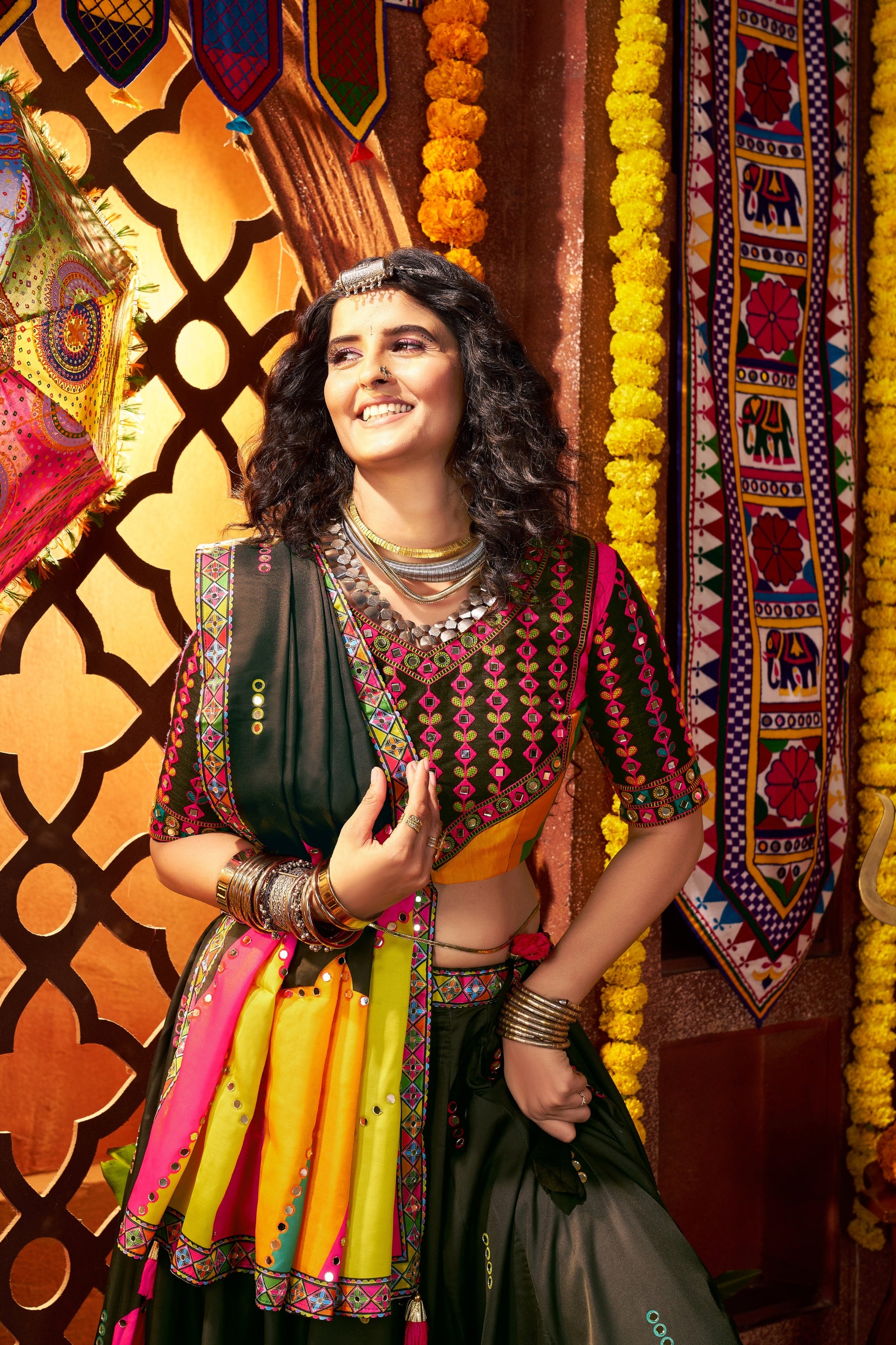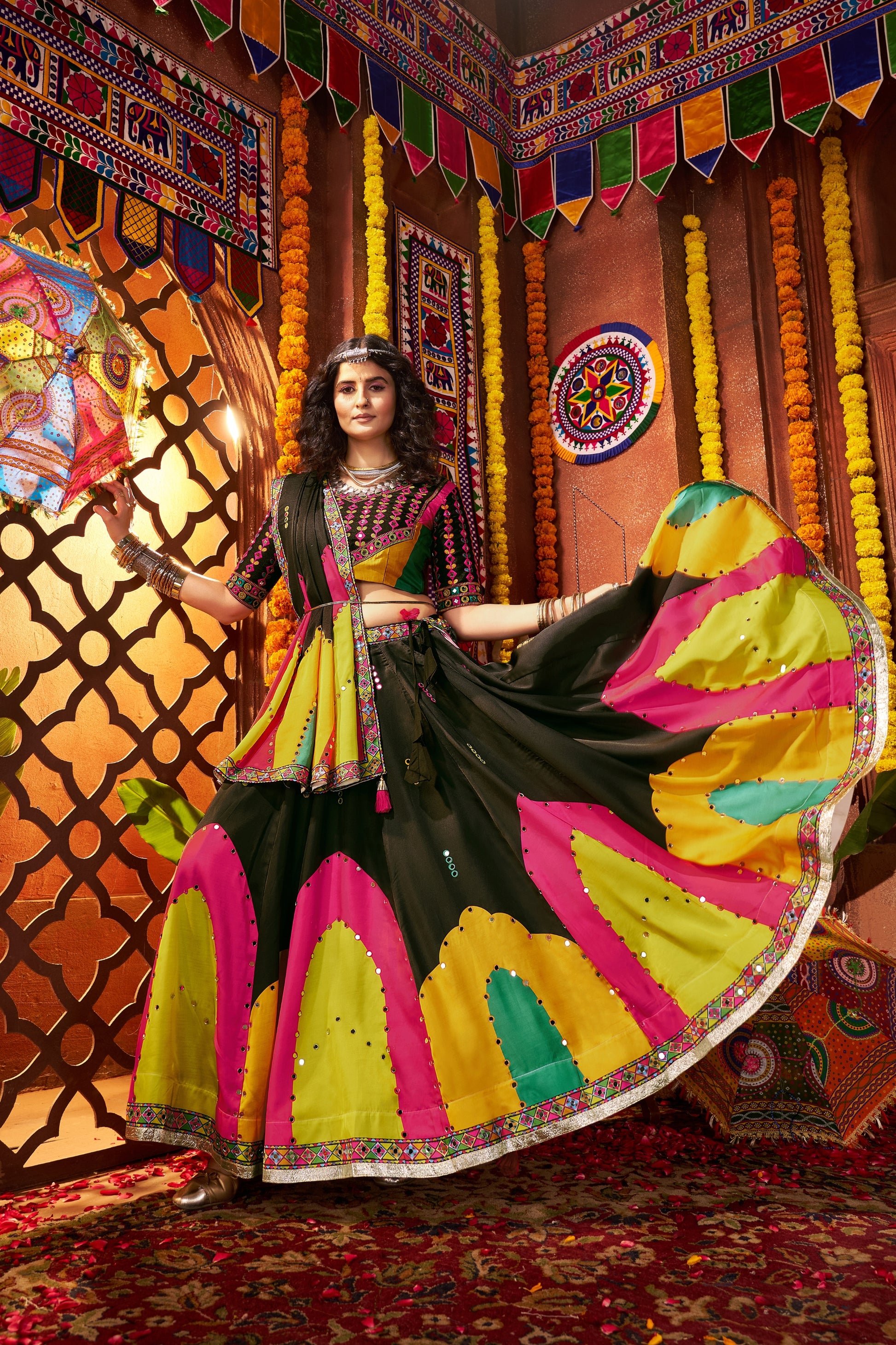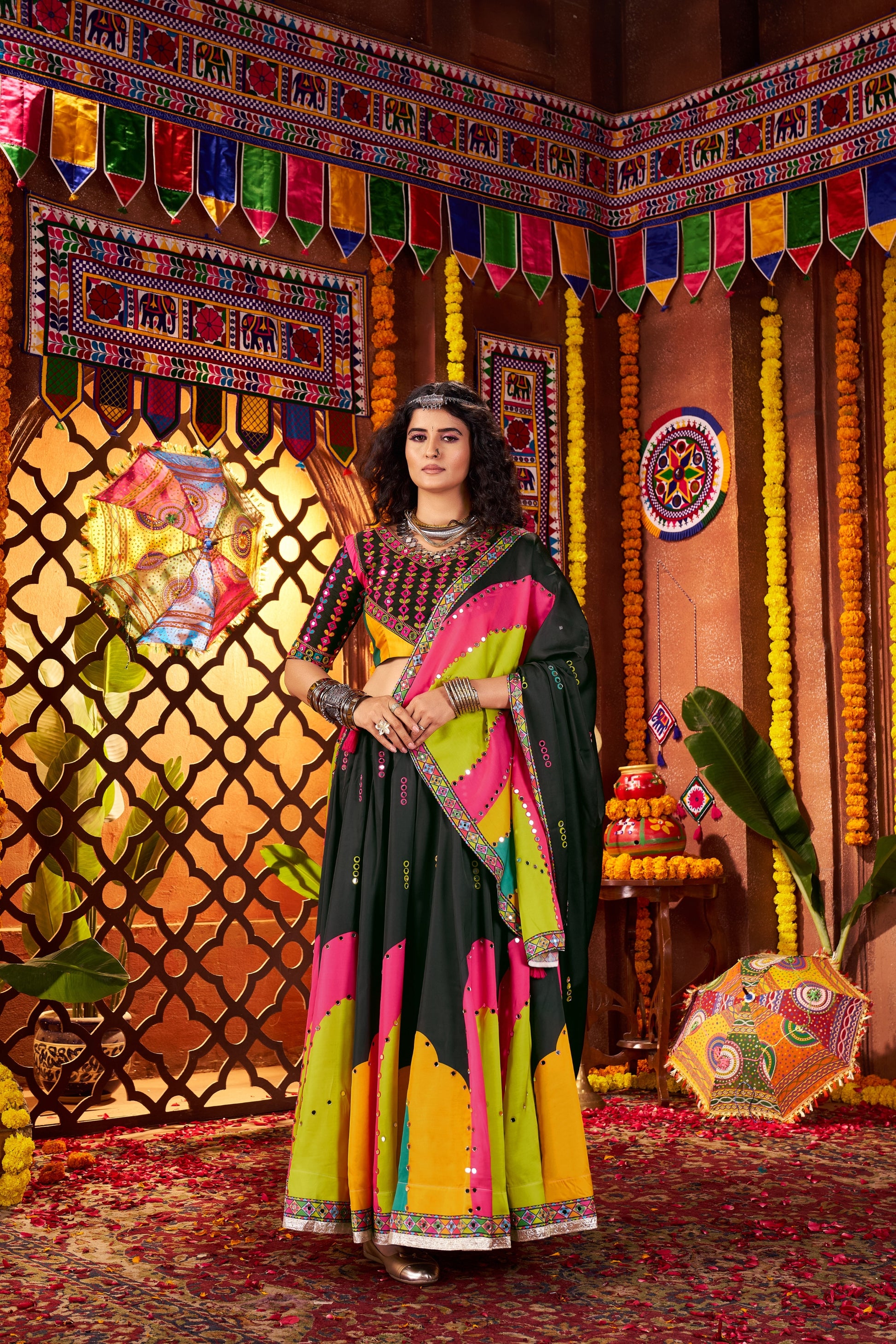 Turn heads this festive season with this gorgeous Black Multicolor Embroidered Navratri Chaniya Choli with Dupatta, specially designed for Garba Nights, Dandiya Raas, and Traditional Celebrations. The lehenga features vibrant shades of yellow, pink, and green on a bold black base, paired with a beautifully embroidered multicolor blouse and a matching dupatta. The intricate Gujarati-inspired embroidery and mirror-work detailing add a touch of authenticity and charm, making it a perfect pick for Navratri and festive occasions. Crafted with soft and breathable fabric, this chaniya choli ensures comfort and elegance throughout long celebrations.
