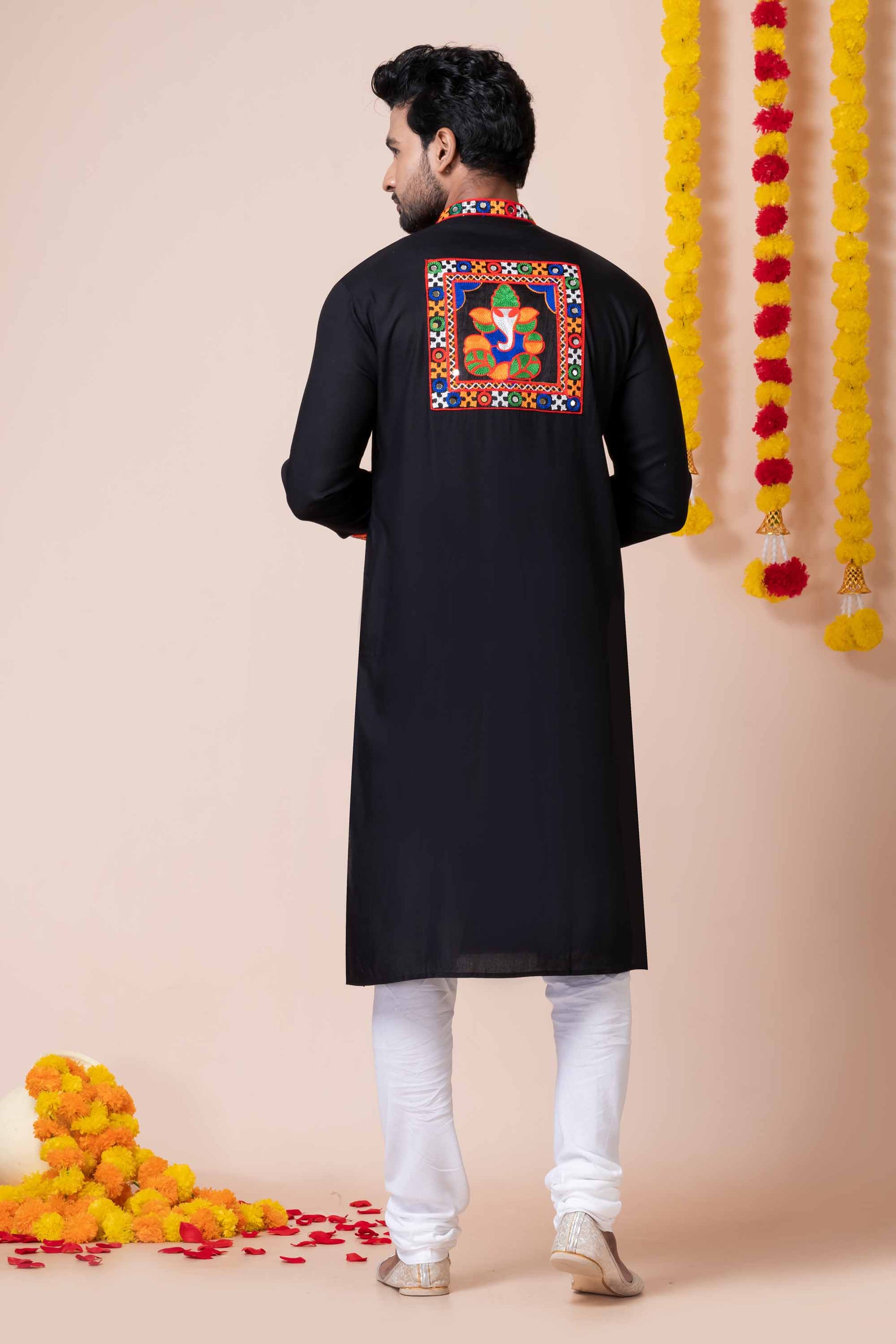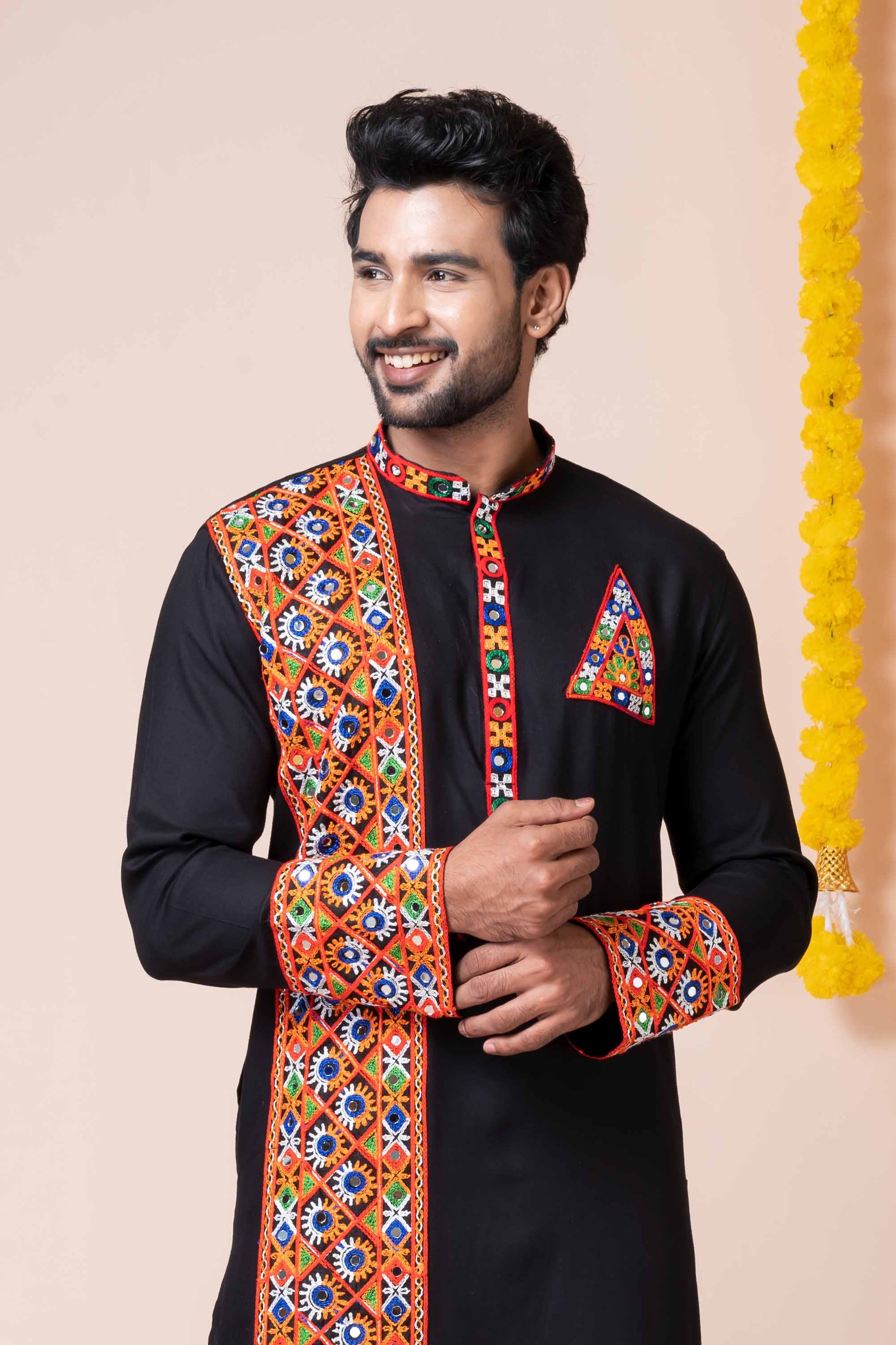 Elevate your festive and traditional look with this Black Rayon Kurta with Multicolor Mirror Embroidery for Navratri Festival. Crafted from premium rayon fabric, this kurta features intricate multicolor mirror work and Gujarati patch embroidery on the front panel, cuffs, placket, and pocket for a rich ethnic appeal. The elegant black base enhances the vibrant embroidery, making it a perfect choice for weddings, Navratri, festive gatherings, and cultural celebrations. Paired with comfortable white pajama bottoms, this kurta pajama set offers both style and comfort for any special occasion.