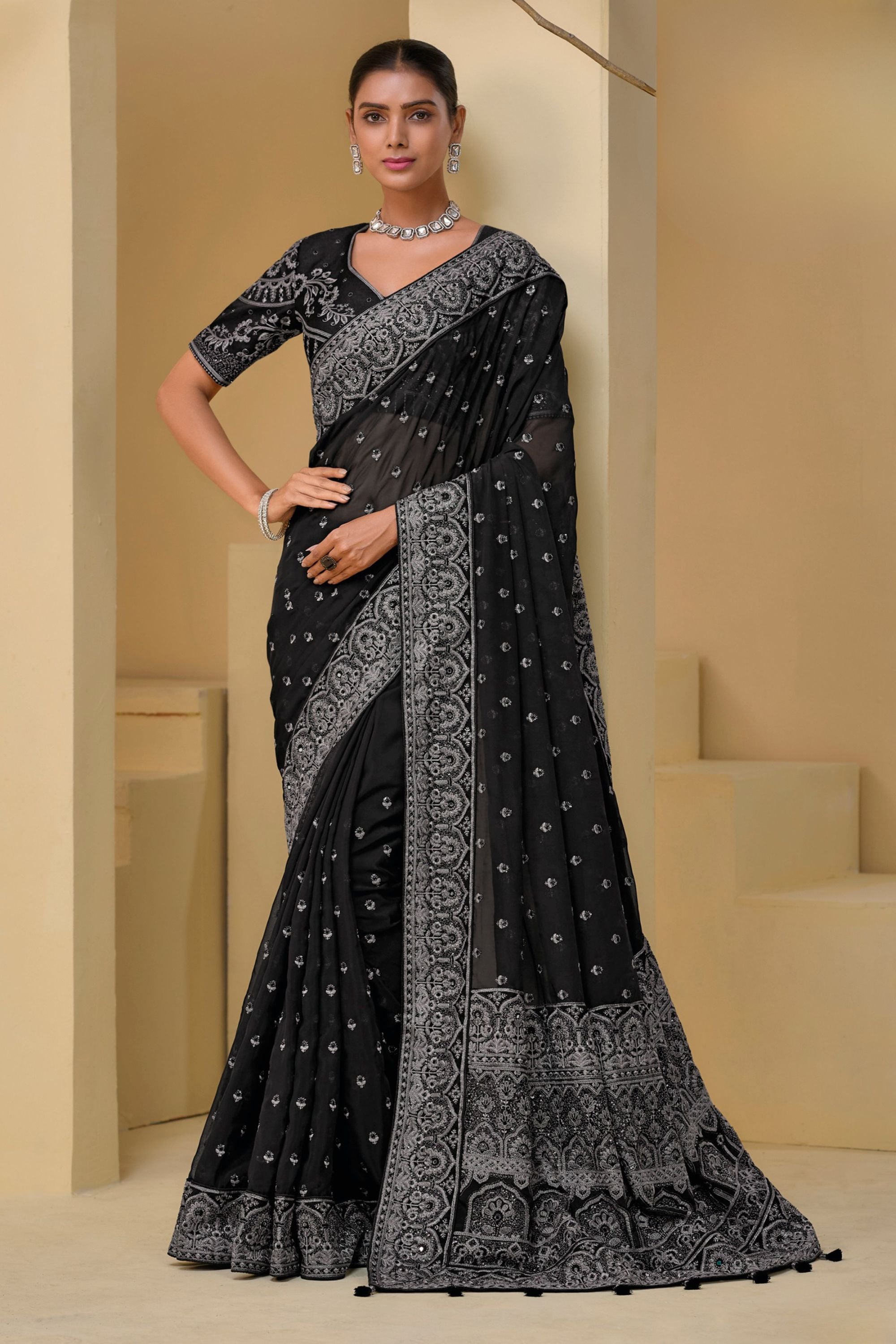 Deep Black Silver Embroidered Designer Saree Party Wear for elegant contrast Crafted from a lightweight, flowing fabricthat drapes beautifully All-over floral and geometric motifs in silver embroidery, including an ornate border and decorated pallu Statement scalloped or embellished border frames the saree, while the pallu is richly embroidered to catch the eye Comes with a matching or coordinating blouse piece stitched or unstitched as per design