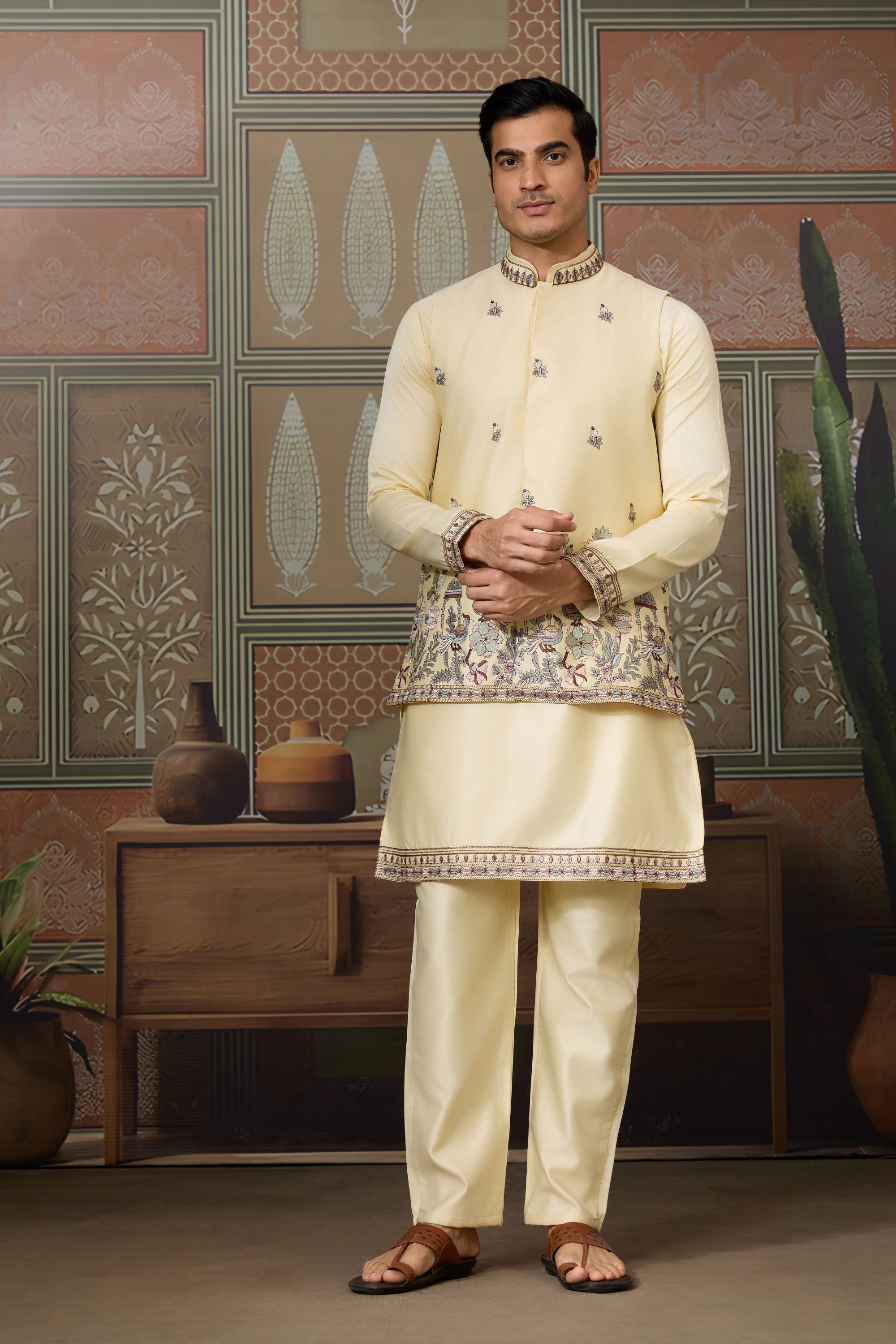 Showcase timeless elegance with this Charming Cream Silk Embroidered Indo Western Kurta Pyjama Set with Jacket. Expertly crafted from luxurious silk fabric, this outfit features intricate embroidery on the jacket, collar, and cuffs, giving it a regal and sophisticated appeal. The cream hue adds a touch of class, while the Indo Western design perfectly balances tradition and modern style. Ideal for weddings, receptions, festive occasions, and cultural events, this ensemble ensures you stand out with refined grace.