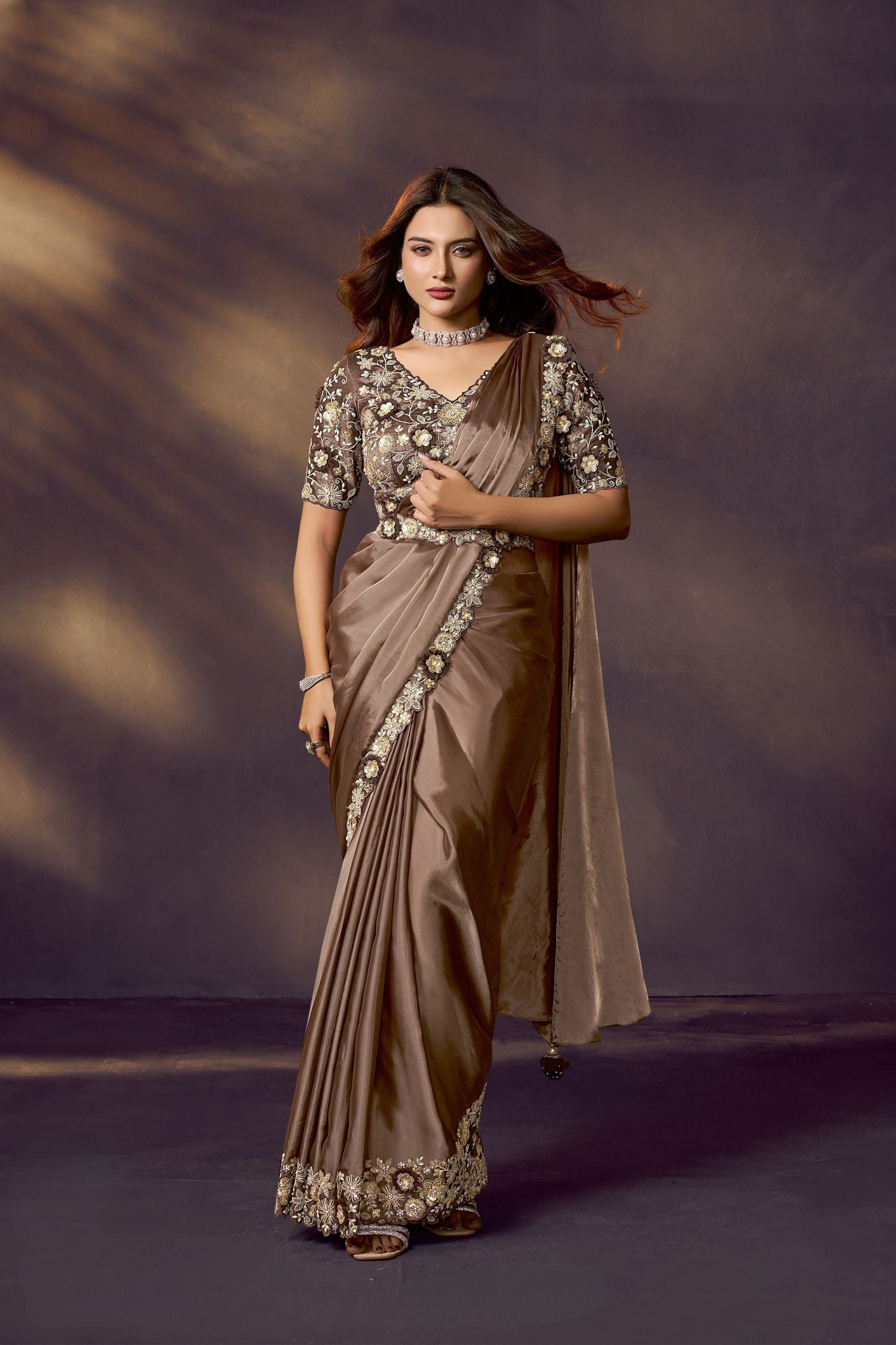 Step into timeless elegance with this Coffee Brown Satin Silk Saree with Heavy Designer Blouse  beautifully adorned with intricate embroidery and sequin detailing. The saree features a rich satin silk fabric that drapes gracefully, exuding sophistication and luxury. Its heavily embellished blouse adds a touch of glamour, making it perfect for wedding receptions, festive occasions, and grand parties. The detailed floral embroidery along the borders and pallu enhances the overall royal look.