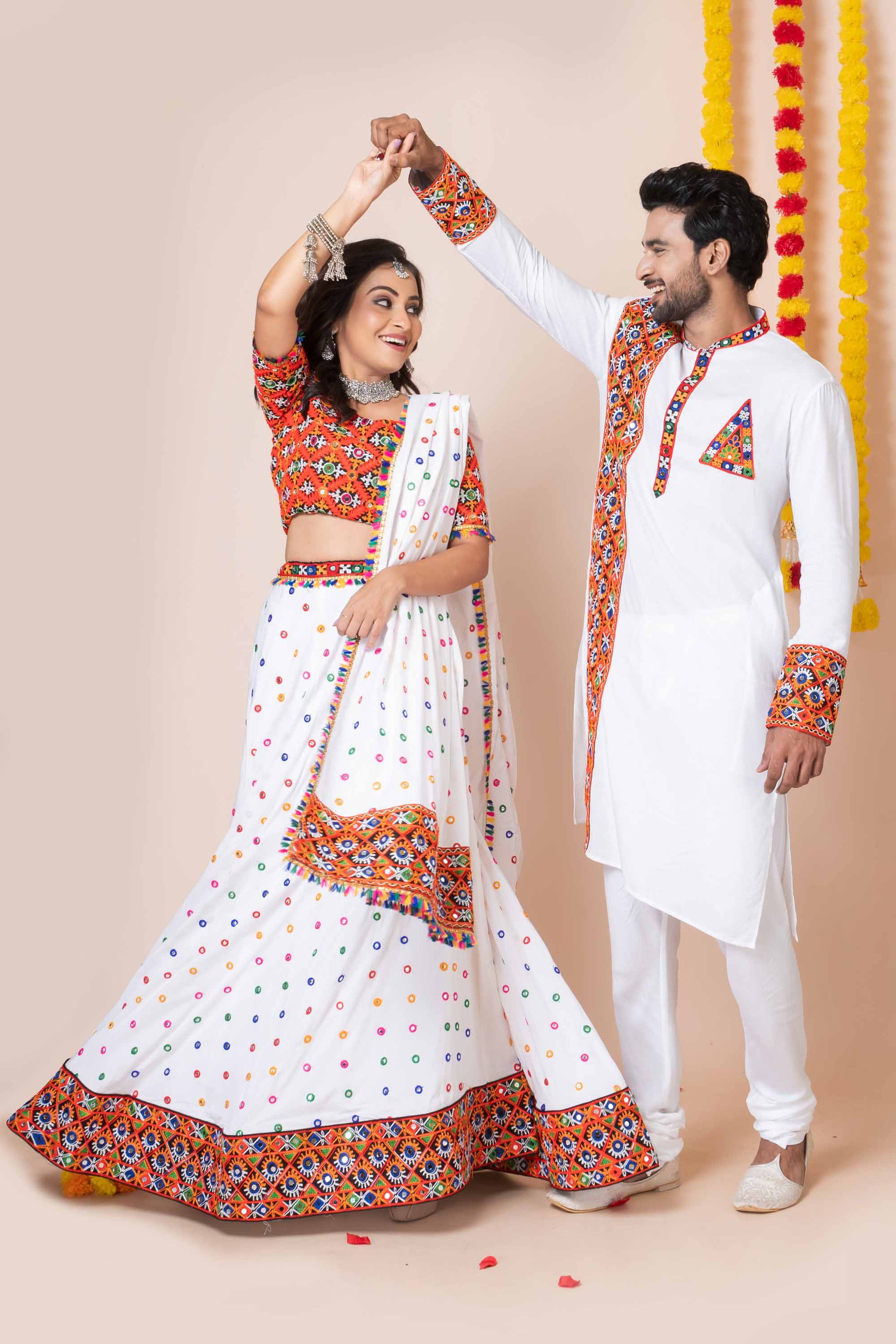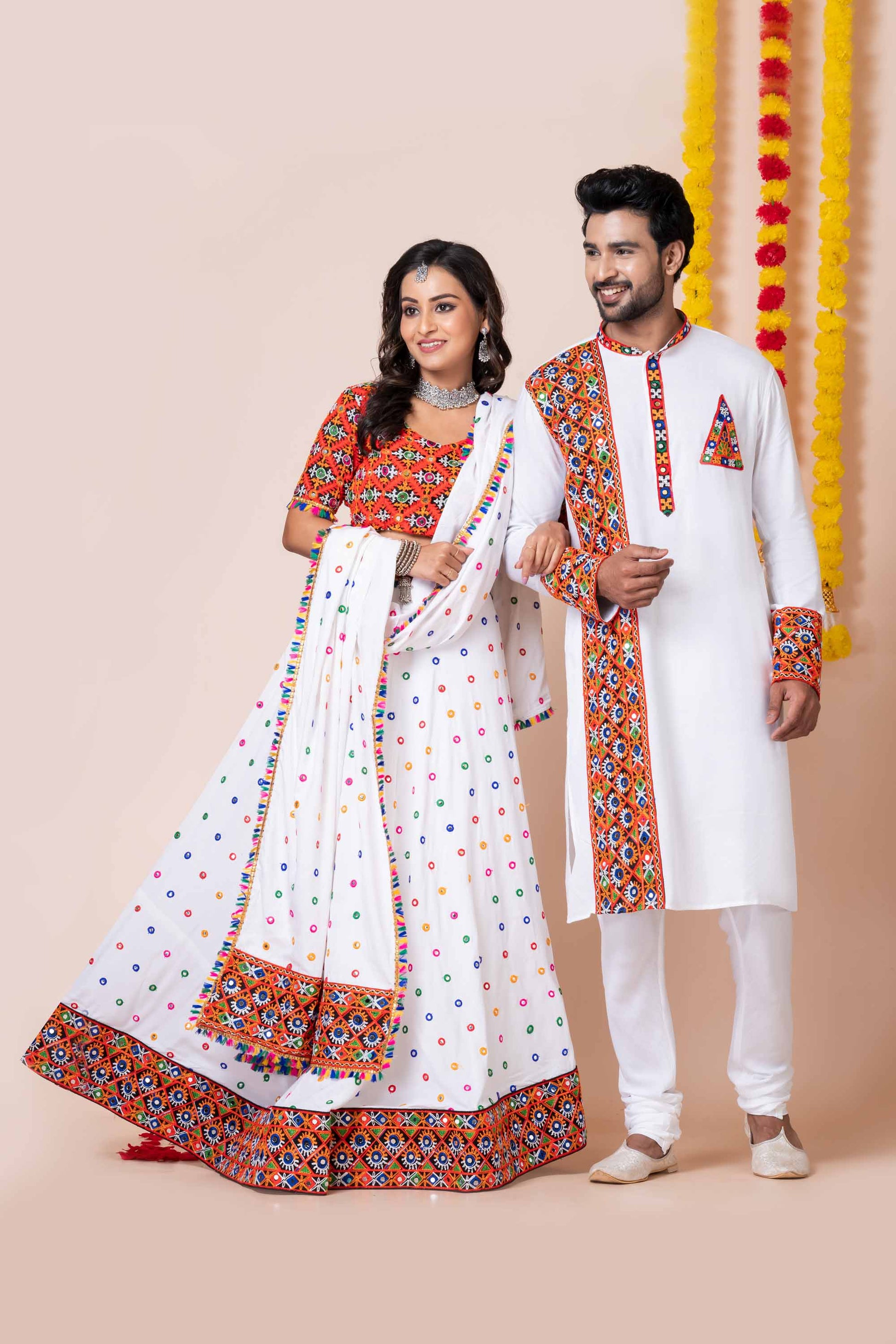 Couple White Gujarati Embroidered Navratri Chaniya Choli and Kurta Set with Mirror Work