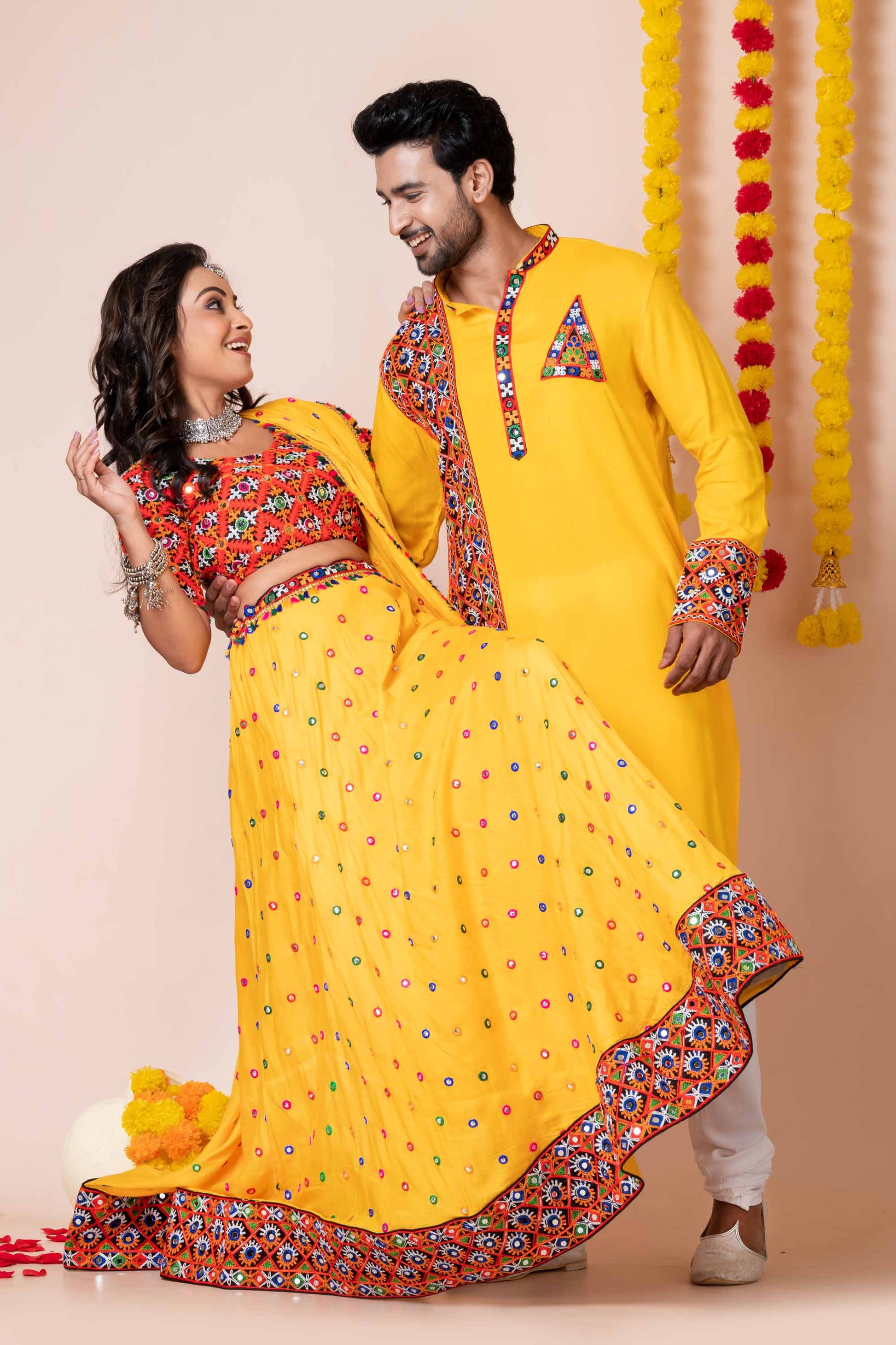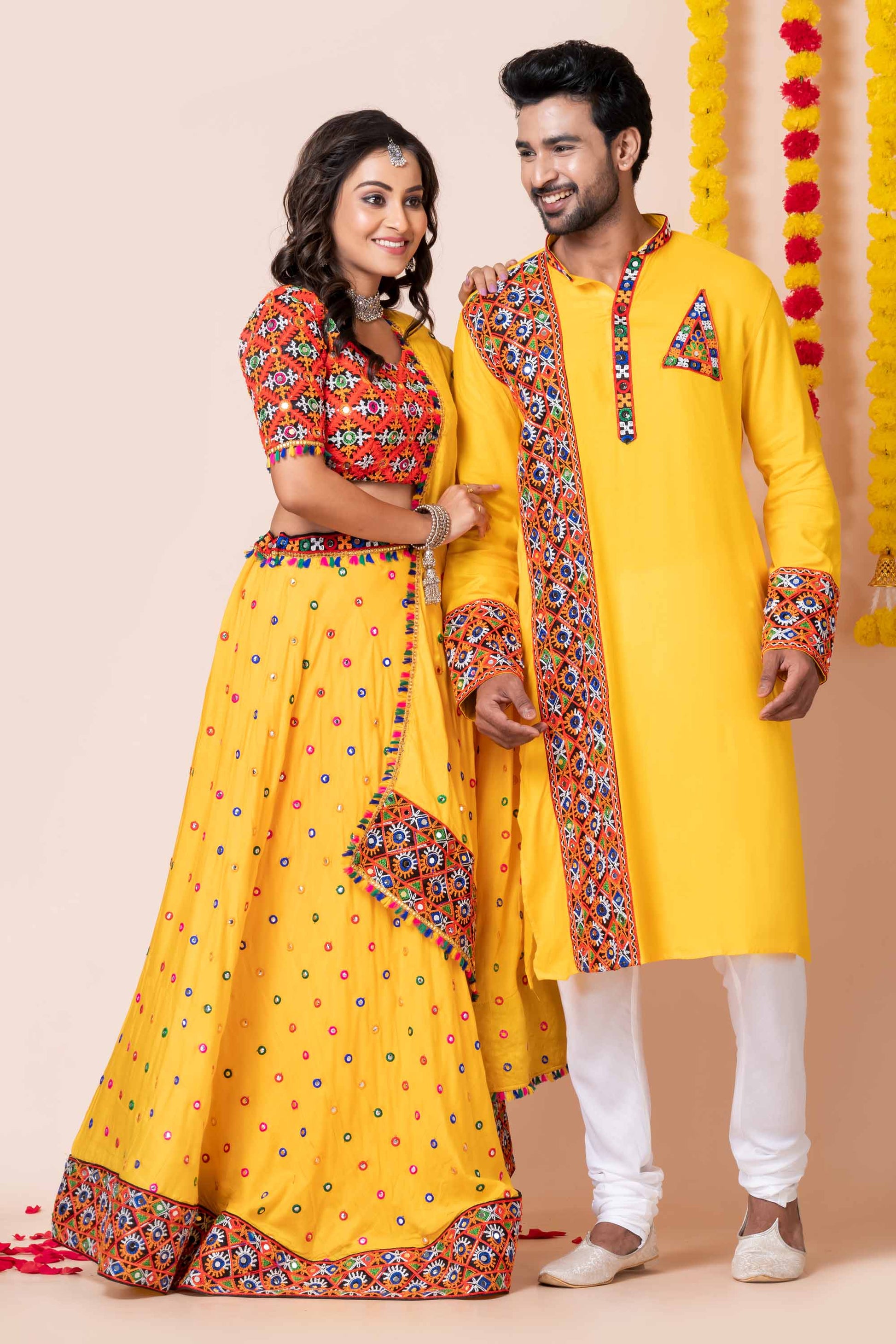 Step into the festive spirit with this Yellow Gujarati Embroidered Couple Outfit Set, perfect for Navratri, Garba nights, and cultural celebrations. The women’s Chaniya Choli features intricate mirror work, multicolor embroidery, and tassel accents that add traditional charm. The men’s Yellow Kurta with embroidered yoke, cuffs, and stole-style detailing perfectly complements the vibrant lehenga, creating a stylish coordinated couple look. Designed from breathable and comfortable fabric, this ethnic wear set is ideal for dancing through long festive nights while keeping tradition alive with modern elegance.