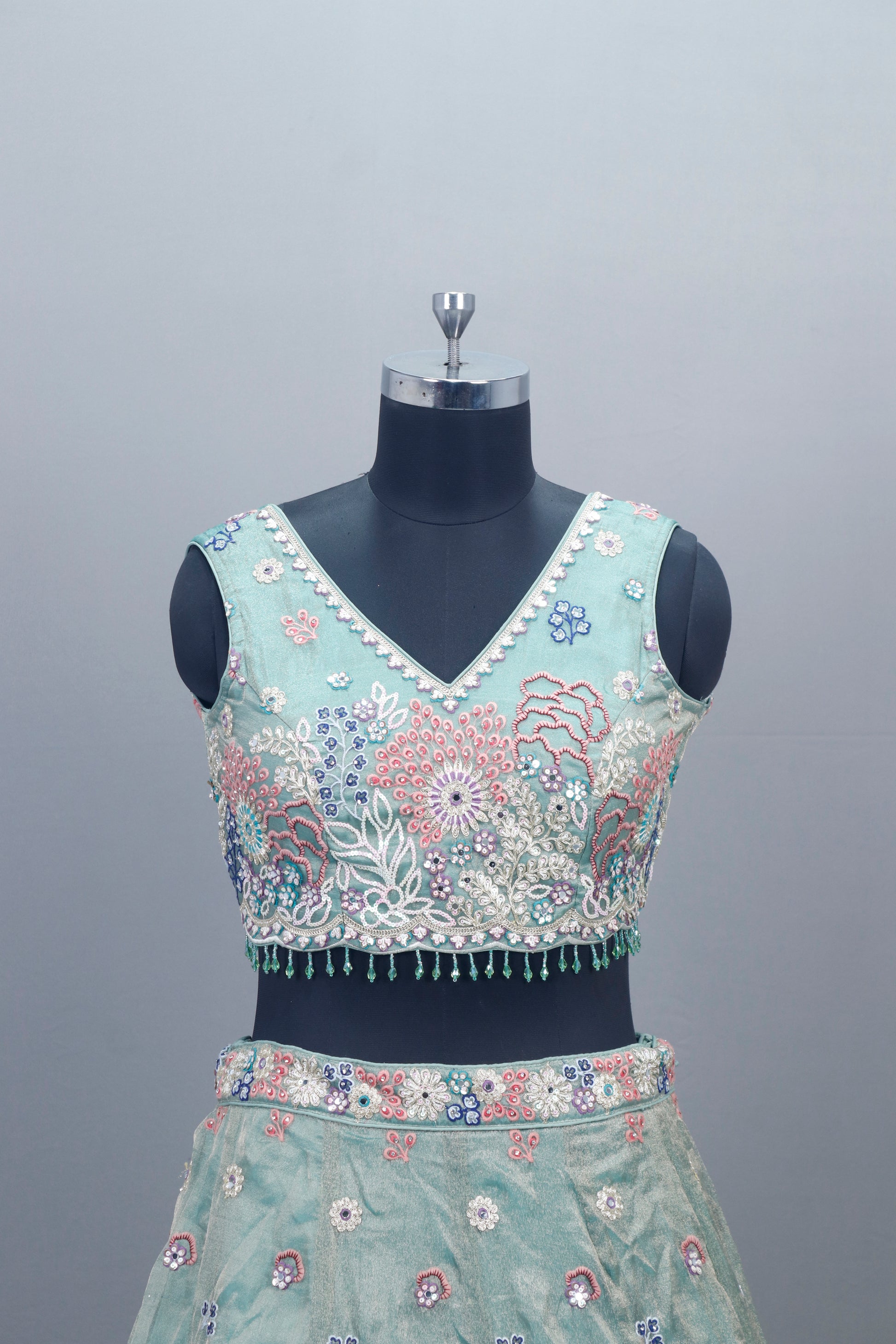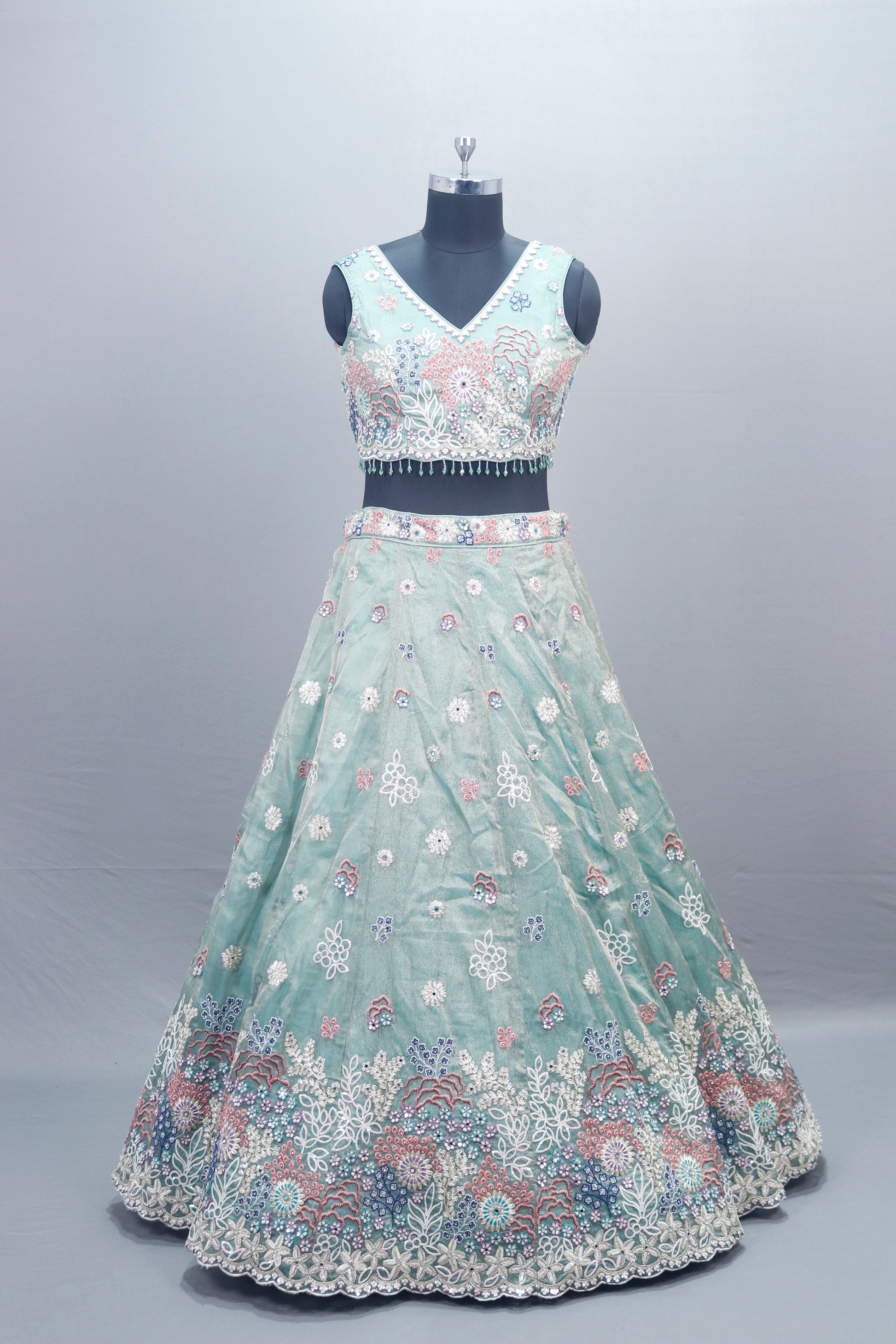 Elevate your ethnic style with this stunning Pastel Blue Net Lehenga Choli with Dupatta Party Wear Lehenga, designed for weddings, parties, and festive occasions. The lehenga features intricate floral embroidery in multicolor threads with shimmering sequins, paired with a sleeveless V-neck choli adorned with delicate bead detailing. A matching embroidered dupatta completes the look, making it a perfect choice for bridesmaids, sangeet, mehendi, or reception wear. Crafted with premium net fabric and lightweight lining, this designer lehenga ensures comfort with elegance. Style it with statement jewelry and heels for a graceful and modern ethnic look.