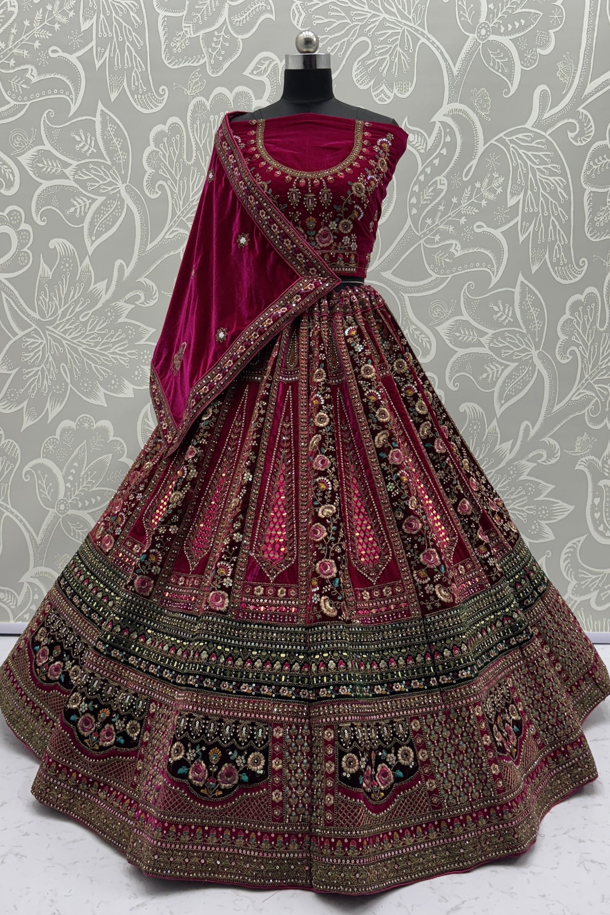 Delicate Burgundy Velvet Bridal Lehenga Choli with Heavy Mirror and Zari Embroidery Work