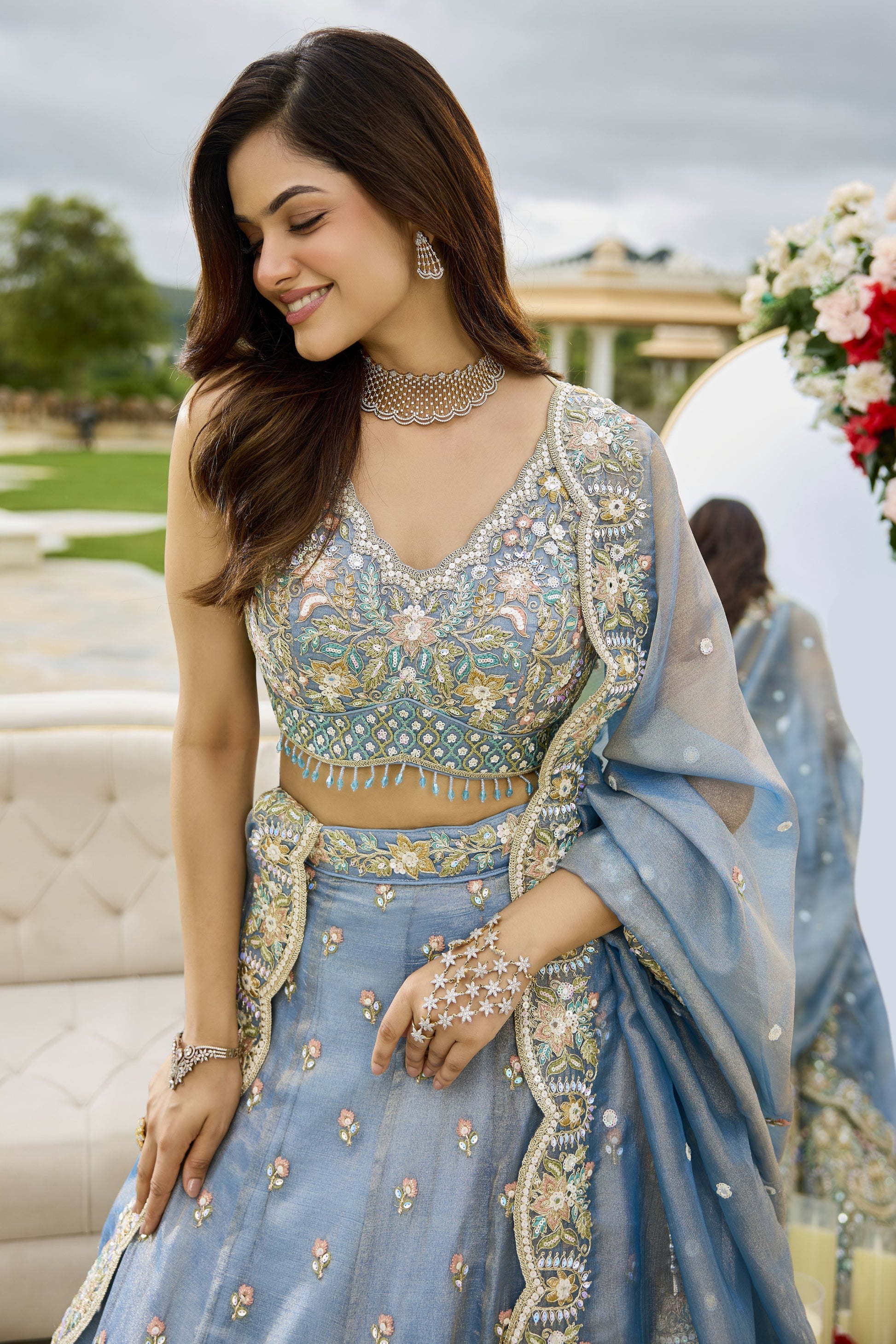 Elevate your ethnic wardrobe with this stunning Delicate Sky Blue Satin Silk Embroidered Lehenga Choli with Dupatta, perfect for weddings, receptions, sangeet, engagements, and festive celebrations. Crafted from premium net fabric, this designer lehenga features intricate floral embroidery, sequins, zari, and stonework, making it a statement outfit for modern brides and bridesmaids. The lehenga comes with a beautifully embroidered blouse (choli) and a matching dupatta with heavy lace border, ensuring a regal and graceful look. Designed to blend traditional craftsmanship with contemporary style, this lehenga choli is lightweight, comfortable, and ideal for long celebrations.
