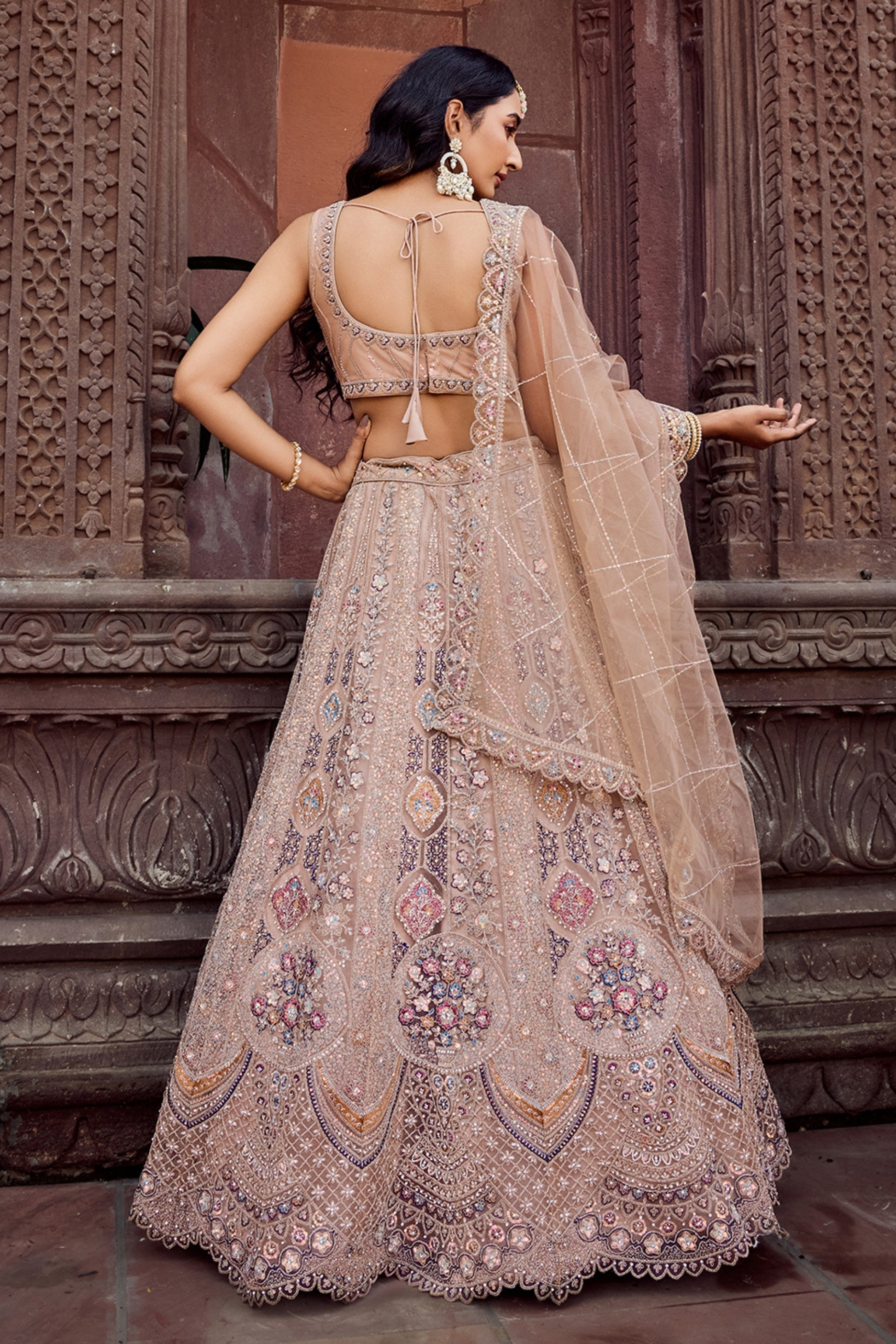 Designer Beige Net Embroidered Wedding Lehenga Choli with Heavy Sequins and Thread Work