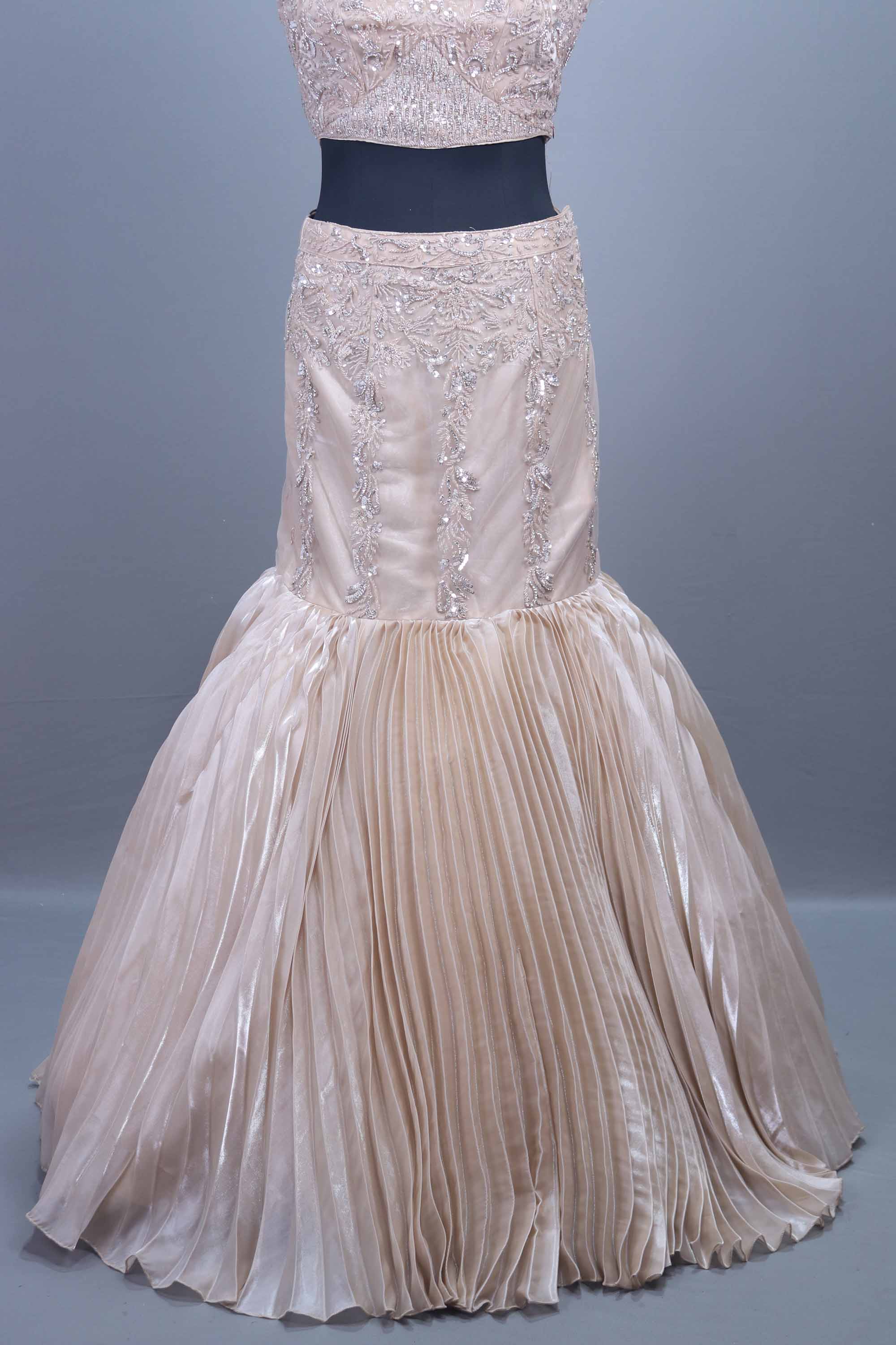 Elevate your festive and wedding wardrobe with this stunning Designer Champagne Mermaid Lehenga Choli Party Wear, crafted to add a glamorous and elegant touch to your special occasions. The lehenga features a beautifully pleated flared skirt that creates a dramatic mermaid silhouette, paired with a heavily embroidered choli adorned with intricate sequins, thread work, and shimmering details. The soft champagne hue adds a luxurious charm, while the lightweight net dupatta with delicate embellishments completes the ensemble with grace. Designed for bridesmaids, engagement ceremonies, sangeet nights, receptions, and party wear, this outfit blends modern styling with traditional craftsmanship.