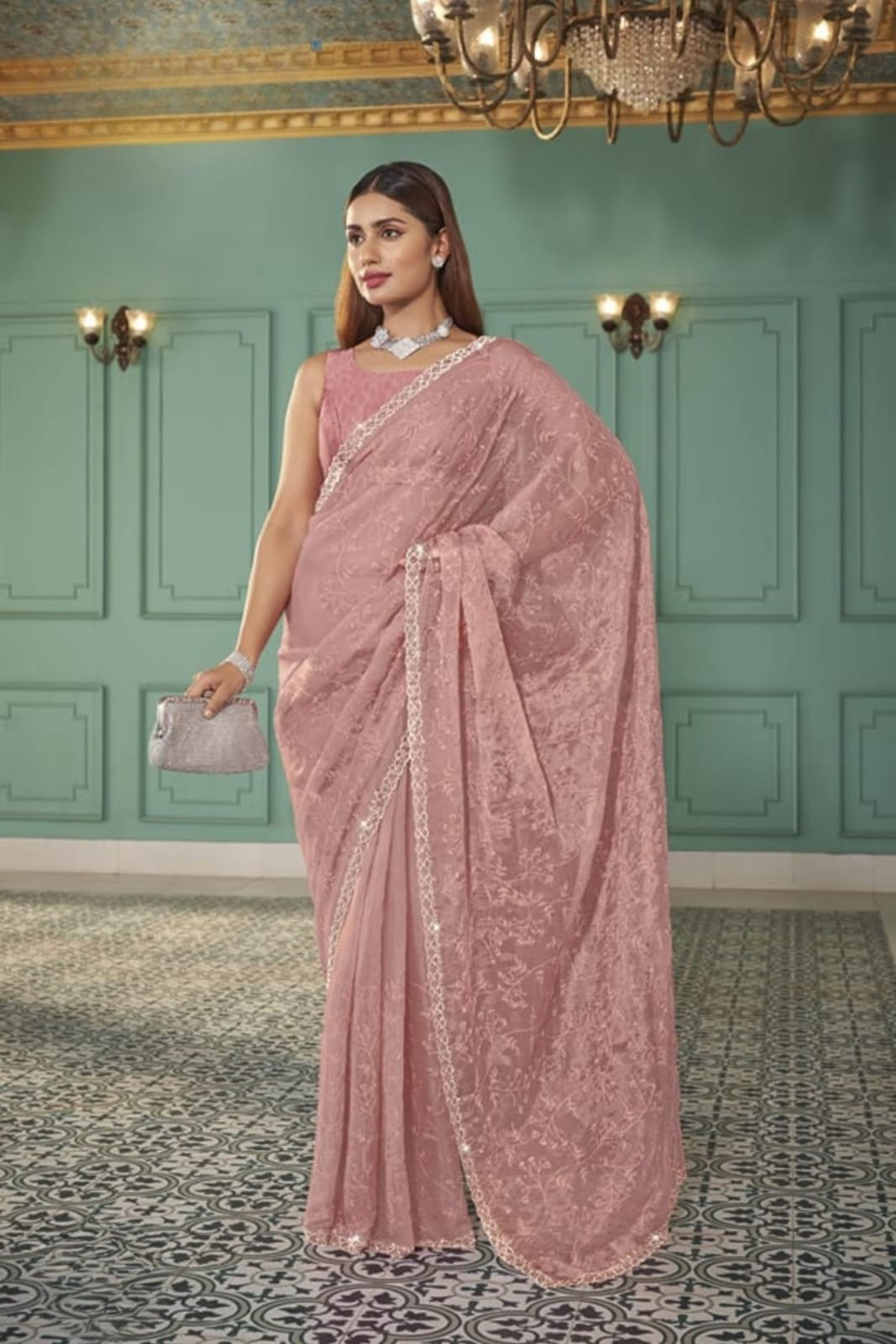 Designer Dusty Pink Net Embroidered Saree with Matching Blouse for Wedding Party Wear