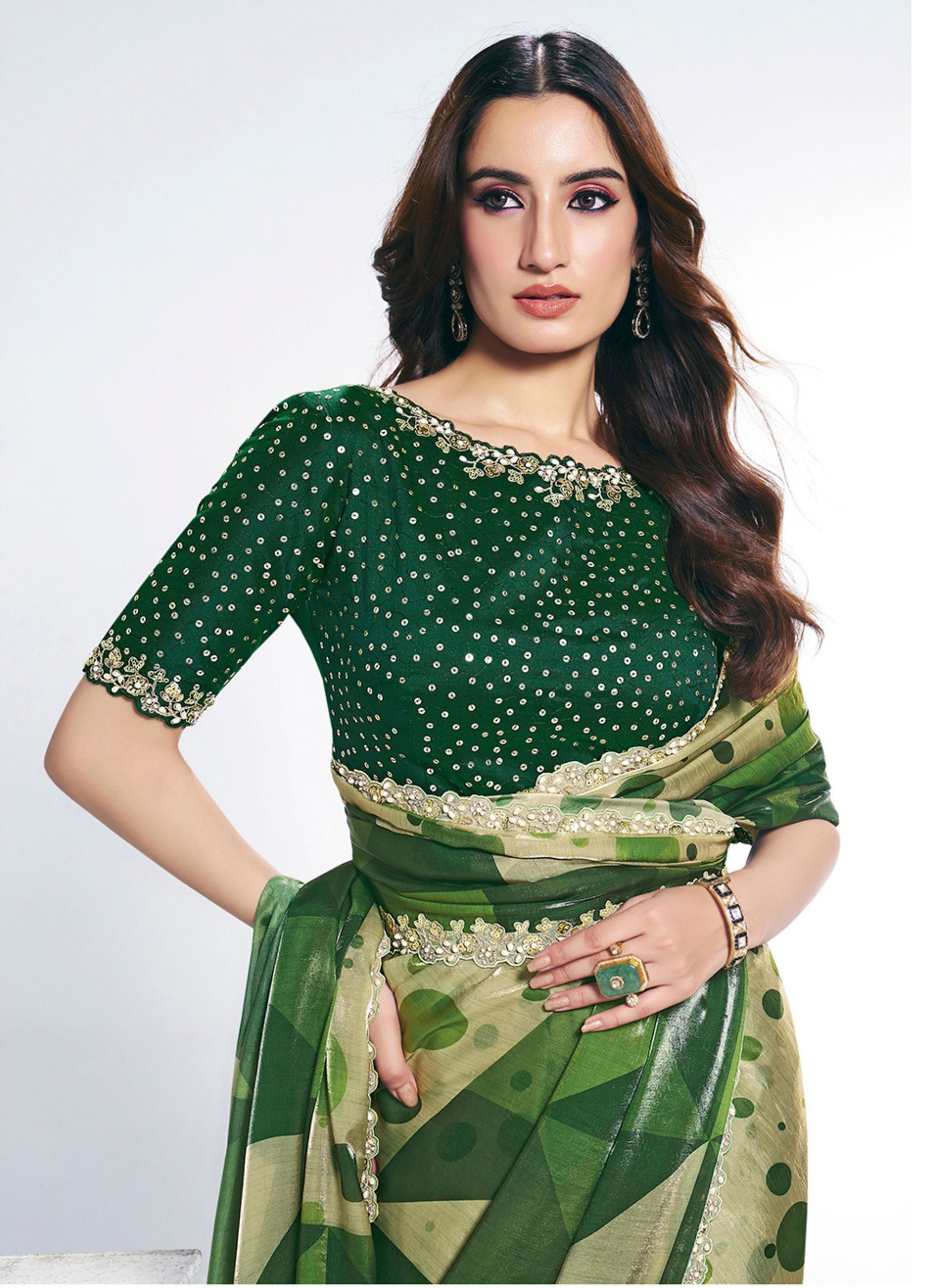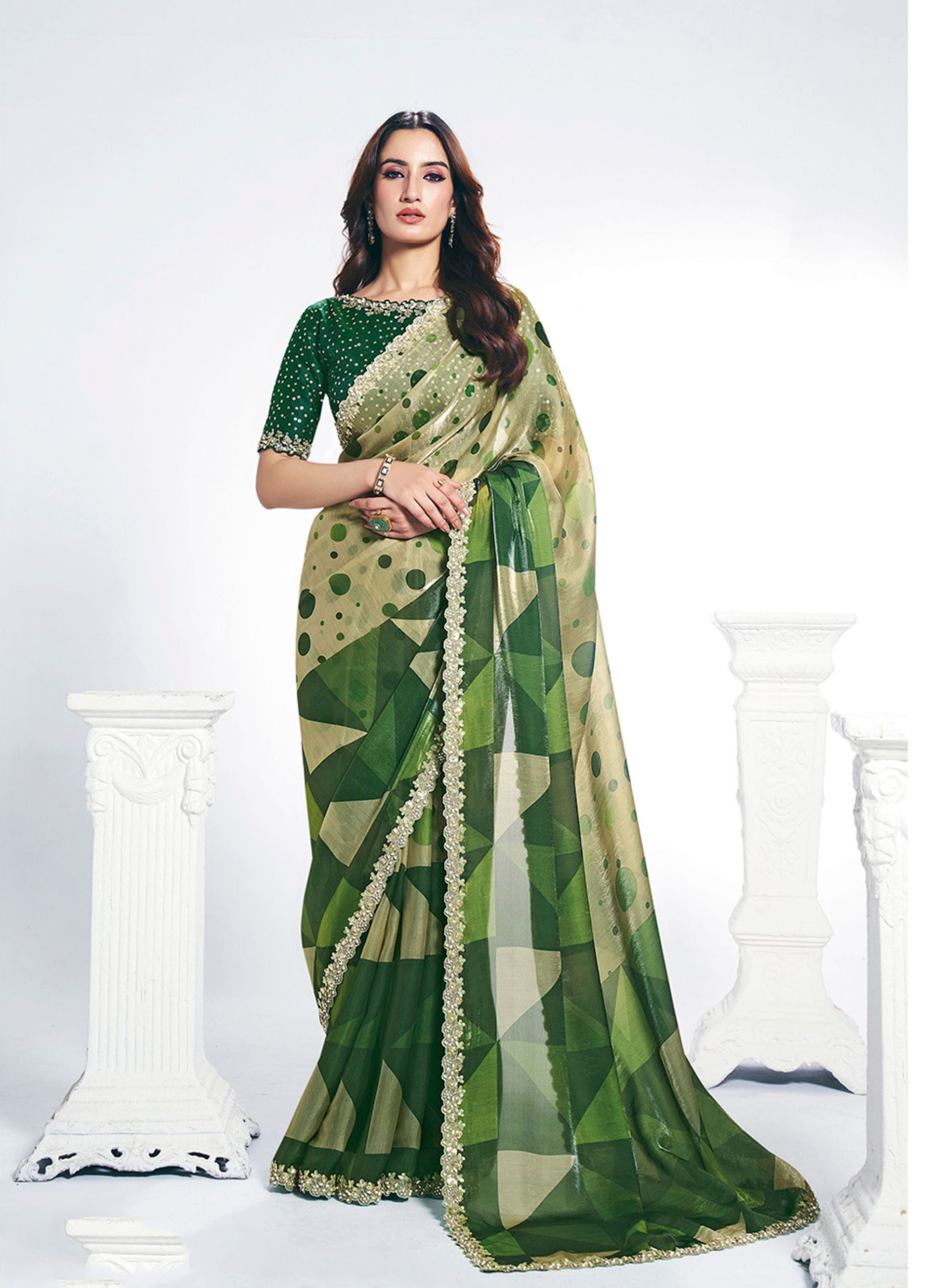 Designer Green Geometric Saree with Stylish Blouse Piece Party Wear Saree