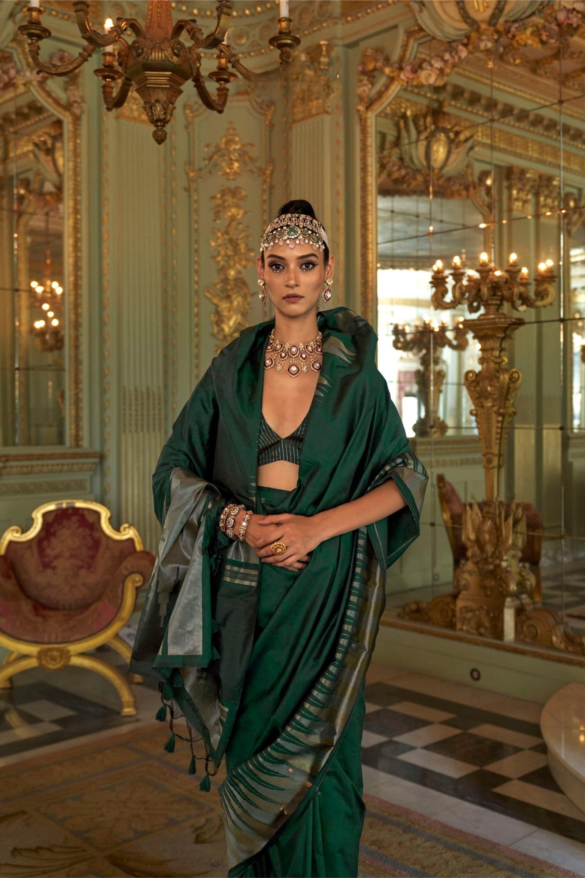 Designer Green Silk Saree with Gold Zari Border Pallu Festive Wear