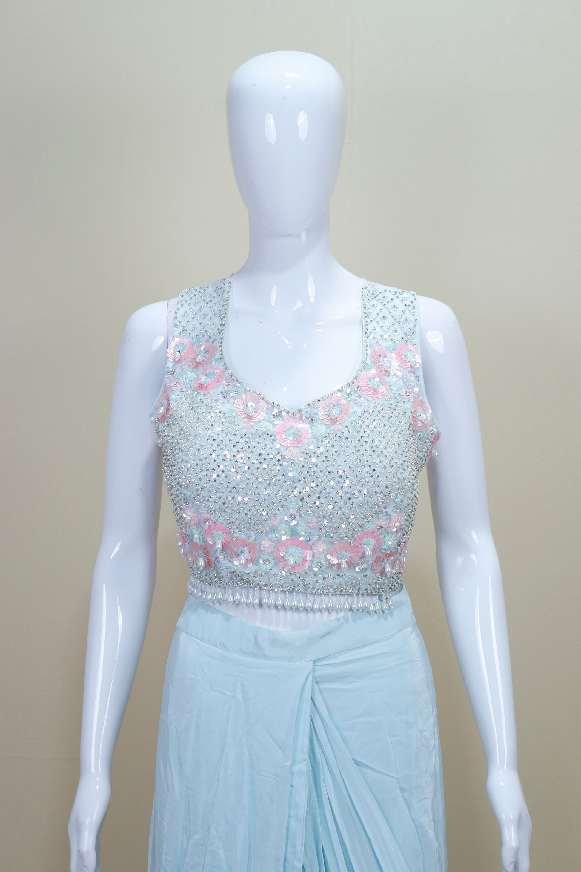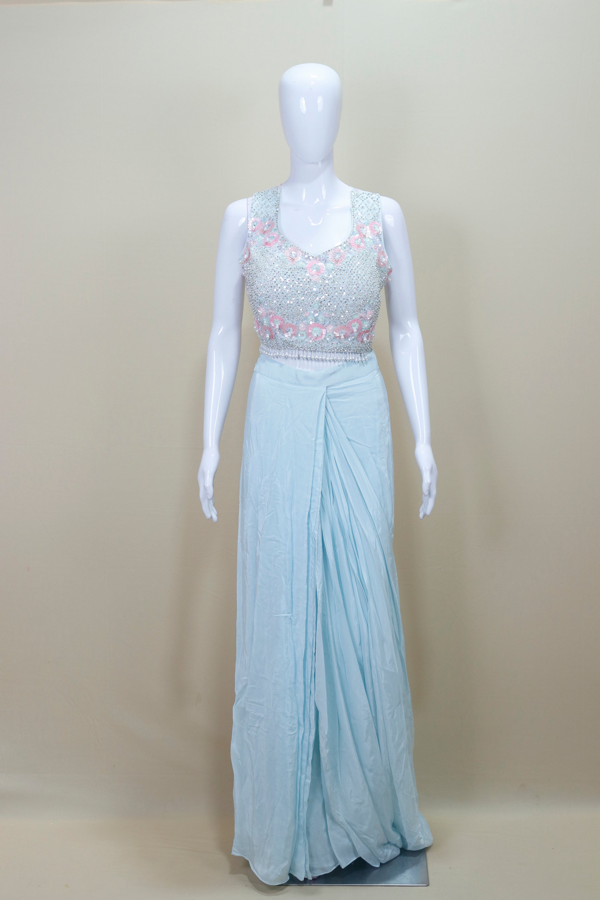Step into elegance with this Designer Light Blue Saree Gown Detailing Party Wedding Wear, a perfect blend of traditional charm and contemporary style. Crafted from premium fabric, this gown features intricate sequin and floral embroidery with delicate beadwork that adds a touch of sparkle. The draped saree-style silhouette offers effortless grace, making it an ideal choice for weddings, receptions, cocktail parties, festive occasions, and evening events. Designed for modern women who love timeless fashion, this gown ensures comfort while giving you a stunning and regal look. Pair it with statement jewelry and heels to complete your dazzling party-ready outfit.