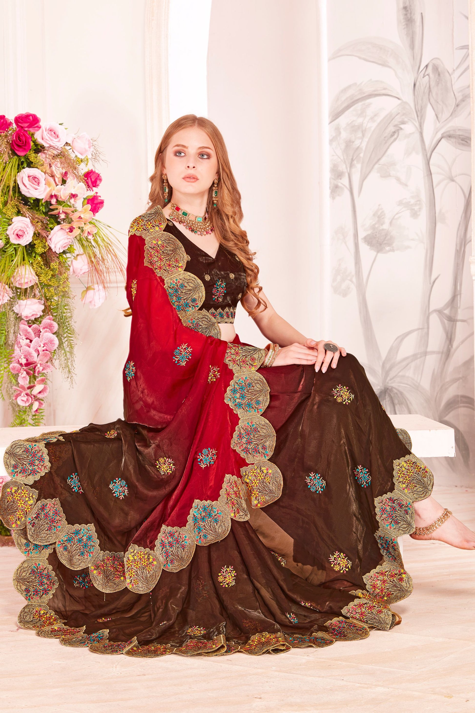 Make a royal style statement with this exquisite Designer Maroon and Brown Silk Saree with Heavy Golden Border Work adorned with rich embroidery and a heavy golden border. Crafted from premium silk fabric, this saree offers a graceful drape and luxurious shine, making it perfect for festive and wedding occasions. The deep maroon pallu is beautifully contrasted with the dark brown pleats, enhanced with colorful floral threadwork and intricate zari embroidery for an elegant finish. The heavy border with golden leaf motifs and multicolor detailing adds a touch of grandeur. Ideal for weddings, receptions, parties, and cultural celebrations, this embroidered silk saree is designed to bring out your timeless beauty.