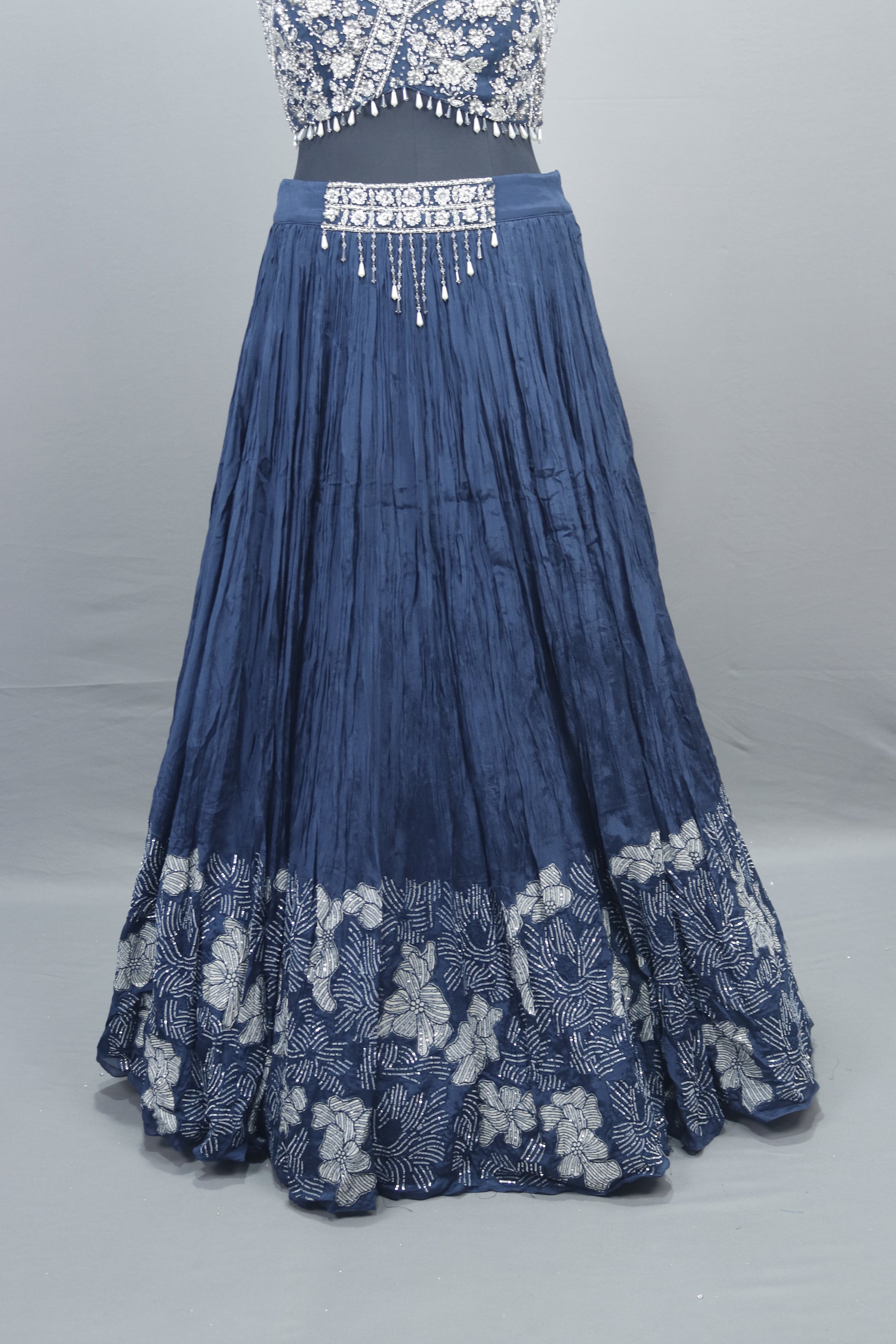 Elevate your ethnic charm with this Designer Navy Blue Embroidered Silk Lehenga Choli with Dupatta perfect for weddings, receptions, and festive celebrations. Crafted from premium silk, the lehenga features intricate silver embroidery, floral motifs, and a gracefully flared silhouette that adds elegance to every step. The embellished blouse with detailed thread and sequin work enhances the luxurious appeal, while the matching dupatta with delicate embroidery completes the ensemble. Ideal for bridesmaids, wedding guests, and festive occasions, this navy blue lehenga choli is a timeless addition to your ethnic wardrobe.