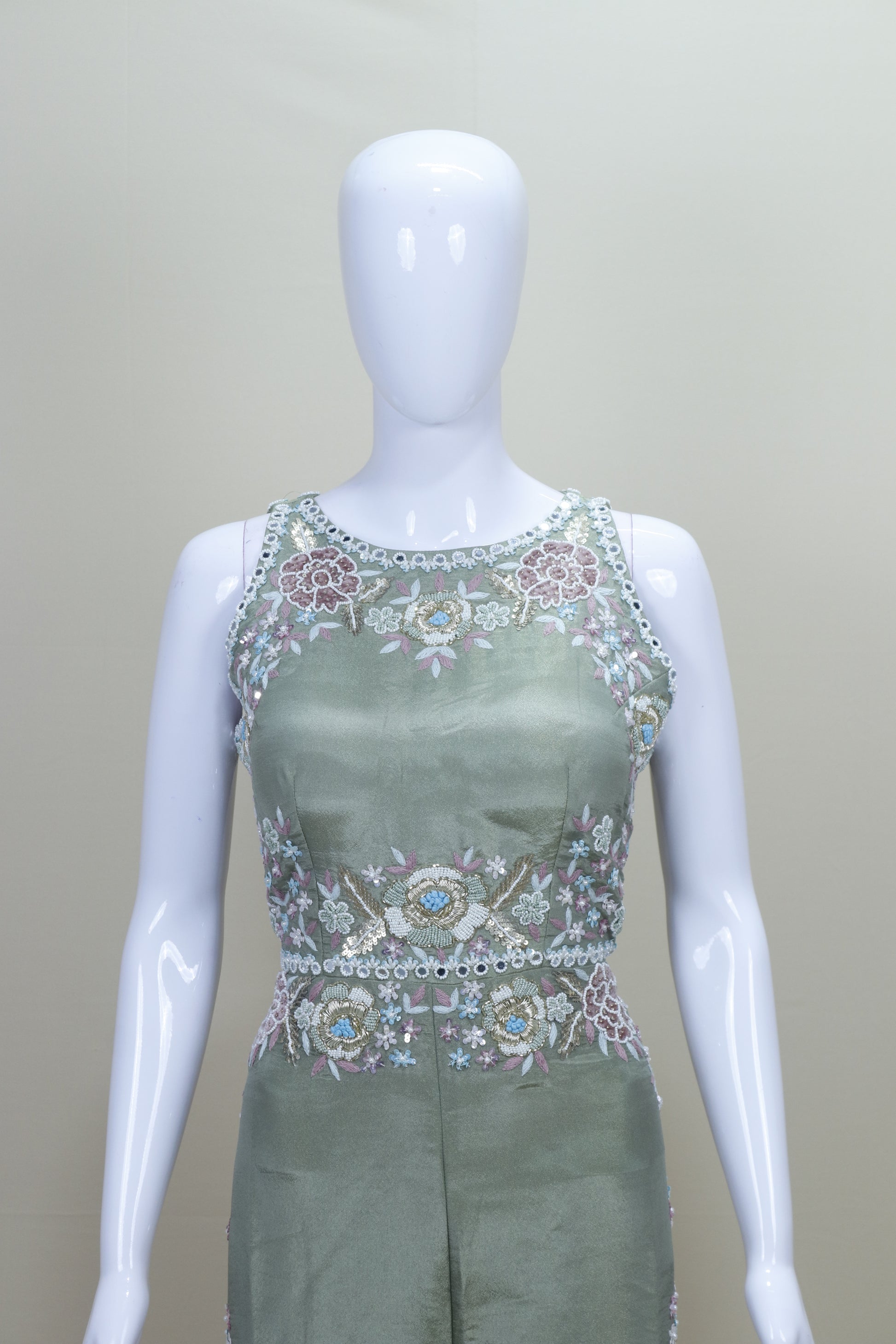 Elevate your ethnic wardrobe with this Designer Olive Green Party Wear Gown Sleeveless Floor Length Ethnic Dress designed for weddings, receptions, festive events, and special parties. Crafted from premium fabric, this sleeveless gown features intricate floral embroidery, a high-neck design, and a graceful floor-length flare that adds charm and sophistication. Perfect for bridesmaids, festive occasions, and evening gatherings, this party wear ethnic dress blends comfort with timeless elegance. Style it with statement jewelry and heels for a stunning look.
