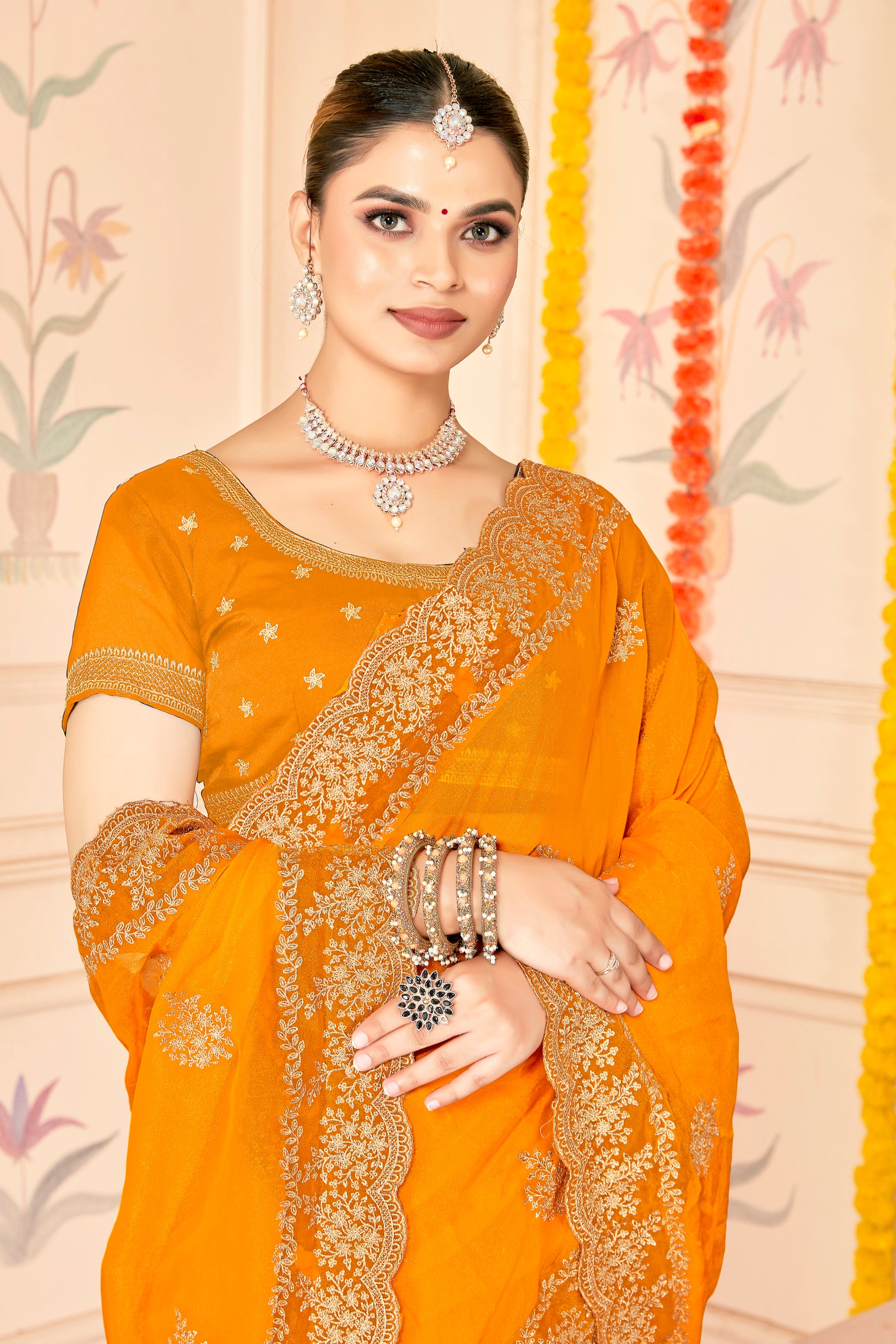 Elevate your ethnic style with this Designer Orange Saree with Golden Blouse Piece Party Wear a perfect blend of elegance and tradition. Crafted from premium georgette fabric, this saree features intricate golden zari embroidery with a beautifully designed scalloped border that enhances its regal charm. Paired with a matching blouse piece, this saree is ideal for weddings, festive occasions, parties, and traditional celebrations. The lightweight georgette drape ensures comfort, while the rich embroidery adds a luxurious appeal, making you stand out effortlessly.