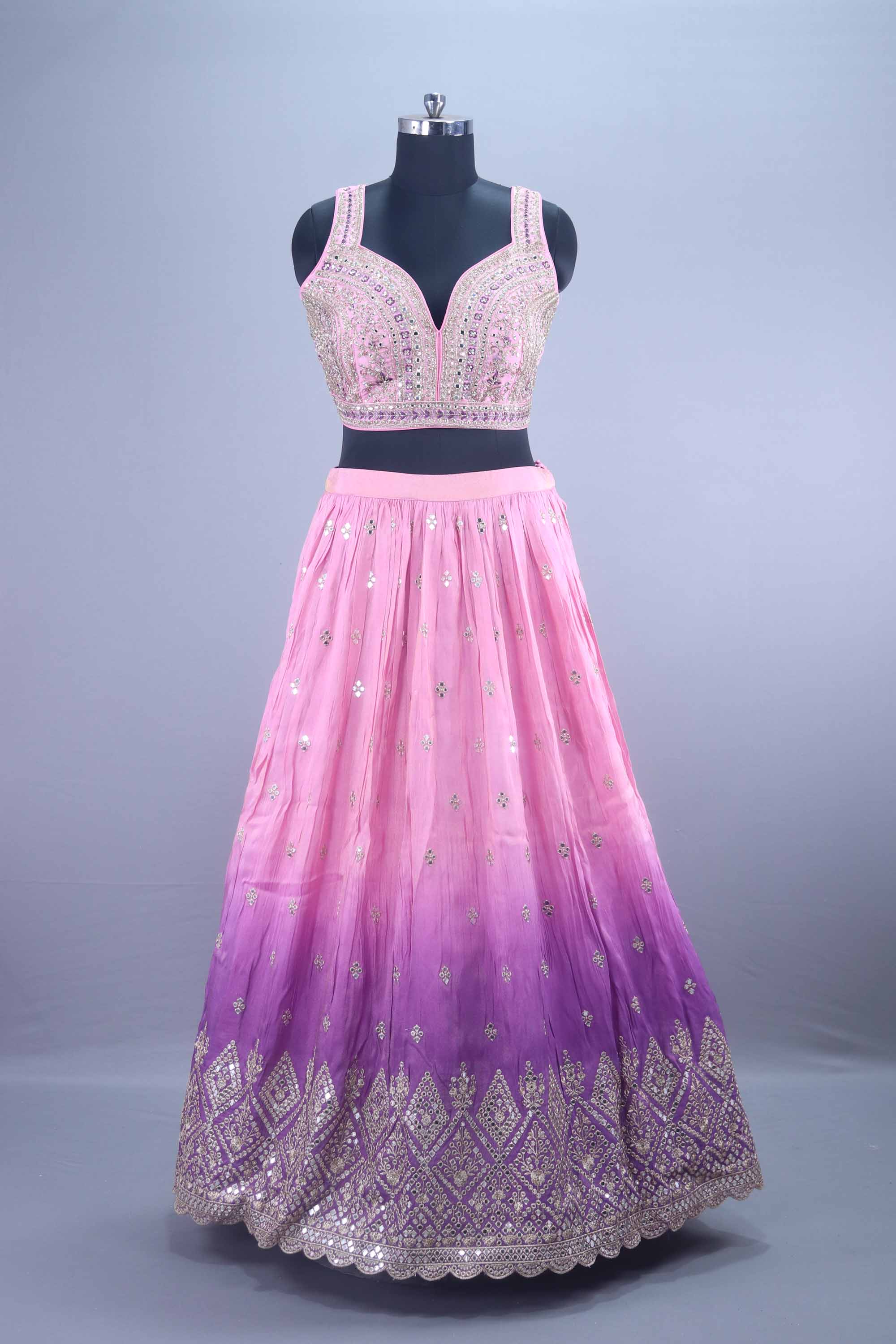 Elevate your festive and wedding look with this stunning Designer Pink and Purple Ombre Embroidered Silk Lehenga Choli with Dupatta Crafted from premium silk fabric, this lehenga features intricate mirror and zari embroidery that adds a luxurious touch to your ensemble. The ombre-dyed skirt flows gracefully from soft pink to rich purple, creating a captivating visual effect perfect for receptions, sangeet, and traditional celebrations. The heavily embellished sleeveless choli comes with a deep neckline and fine sequin work, offering a modern yet ethnic charm. Complementing the outfit is a soft silk dupatta with delicate scalloped borders and tassel accents, completing the royal look.
