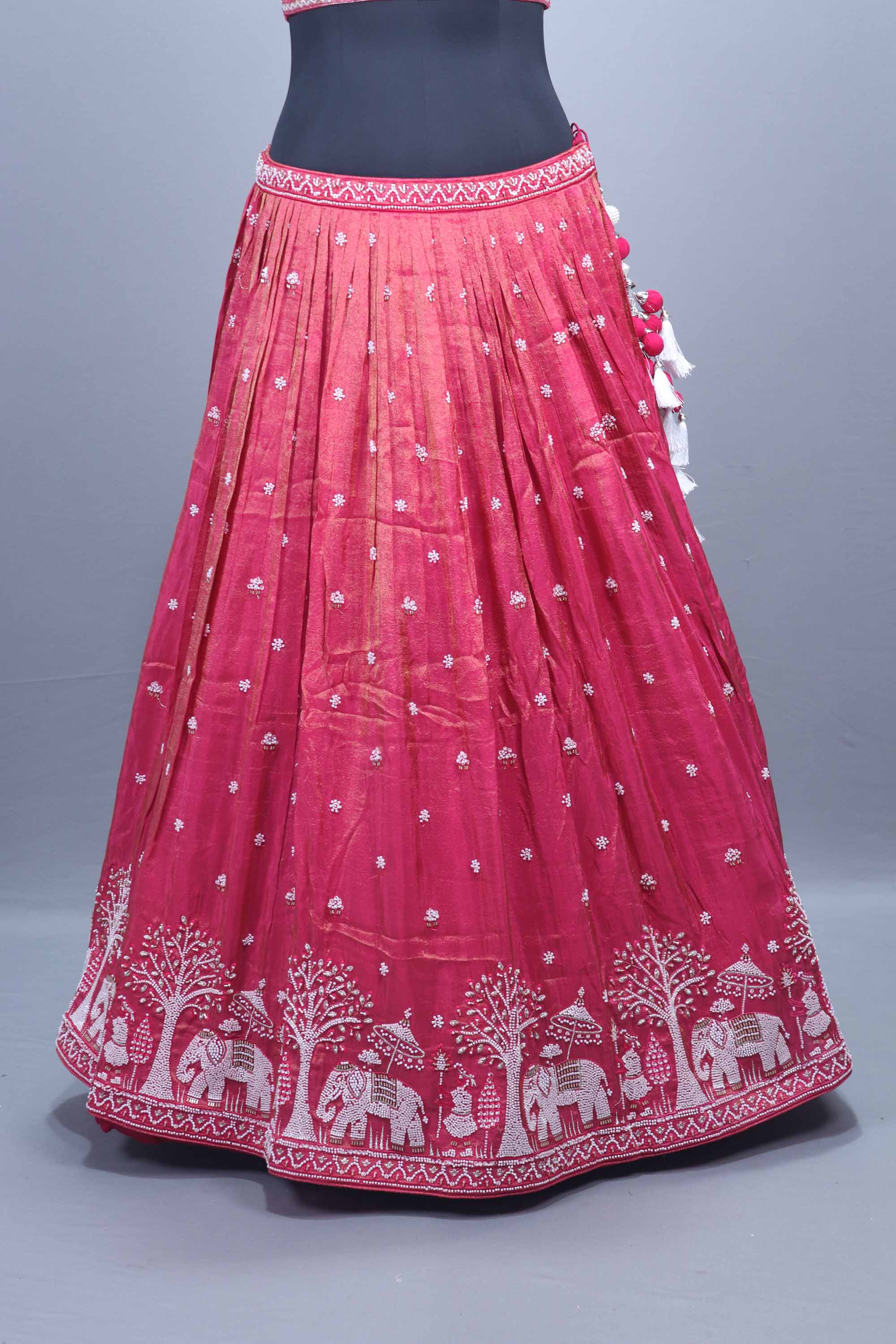 Elevate your festive and wedding wardrobe with this Designer Pink Silk Embroidered Lehenga Choli with Dupatta, beautifully crafted to blend tradition with contemporary elegance. Made from premium silk fabric, the lehenga features intricate white thread embroidery with unique elephant and tree motif borders, adding a royal and cultural touch to the ensemble. The sleeveless embroidered choli comes with heavy detailing for a rich finish, while the matching dupatta showcases delicate embroidered butti work and tassel hangings, enhancing the overall festive charm. Lightweight, comfortable, and stunningly detailed, this lehenga is perfect for weddings, sangeet, mehendi, festive celebrations, and bridal functions.
