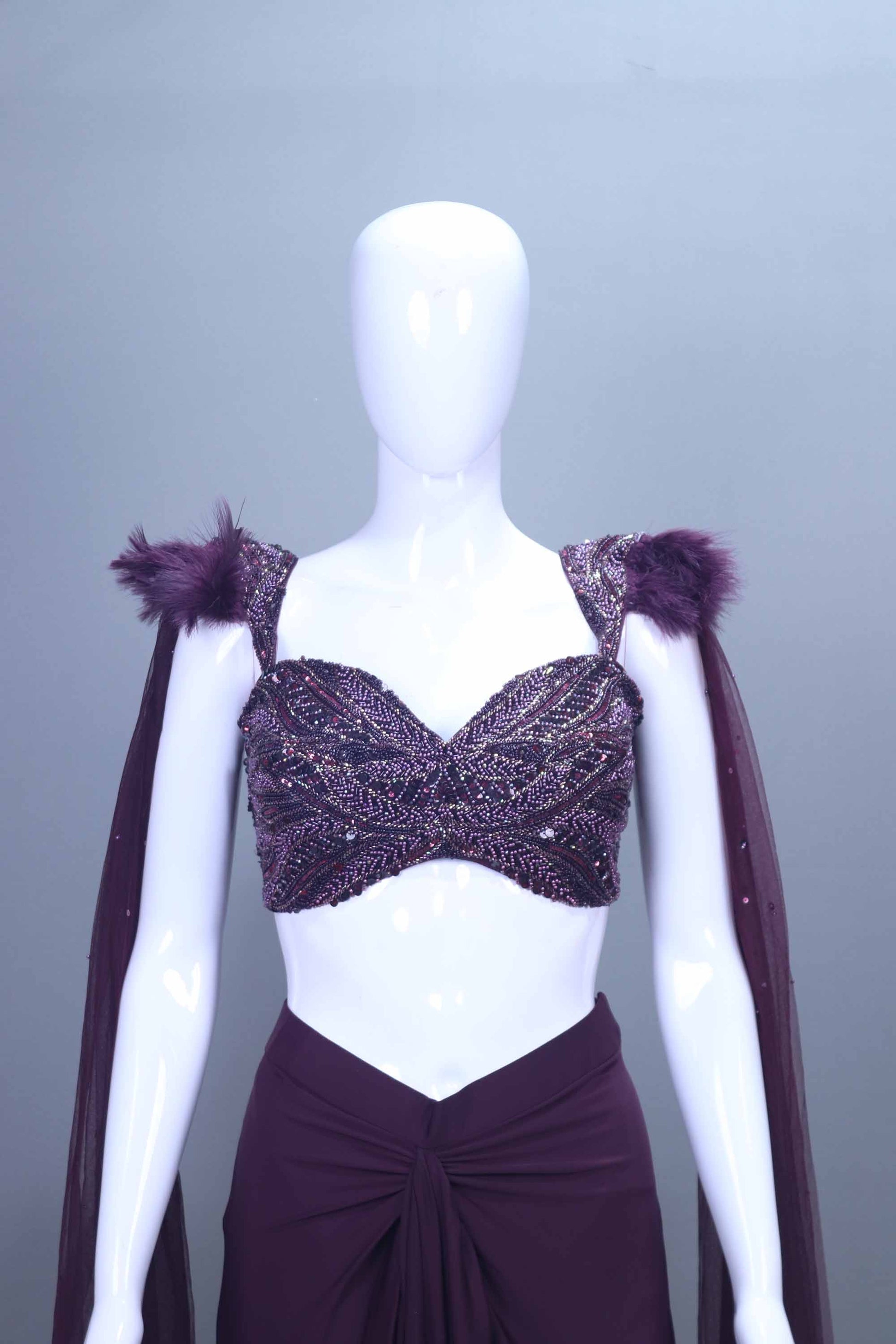 Designer Plum Purple Pre Draped Indo Western Gown with Feather Detailed Blouse