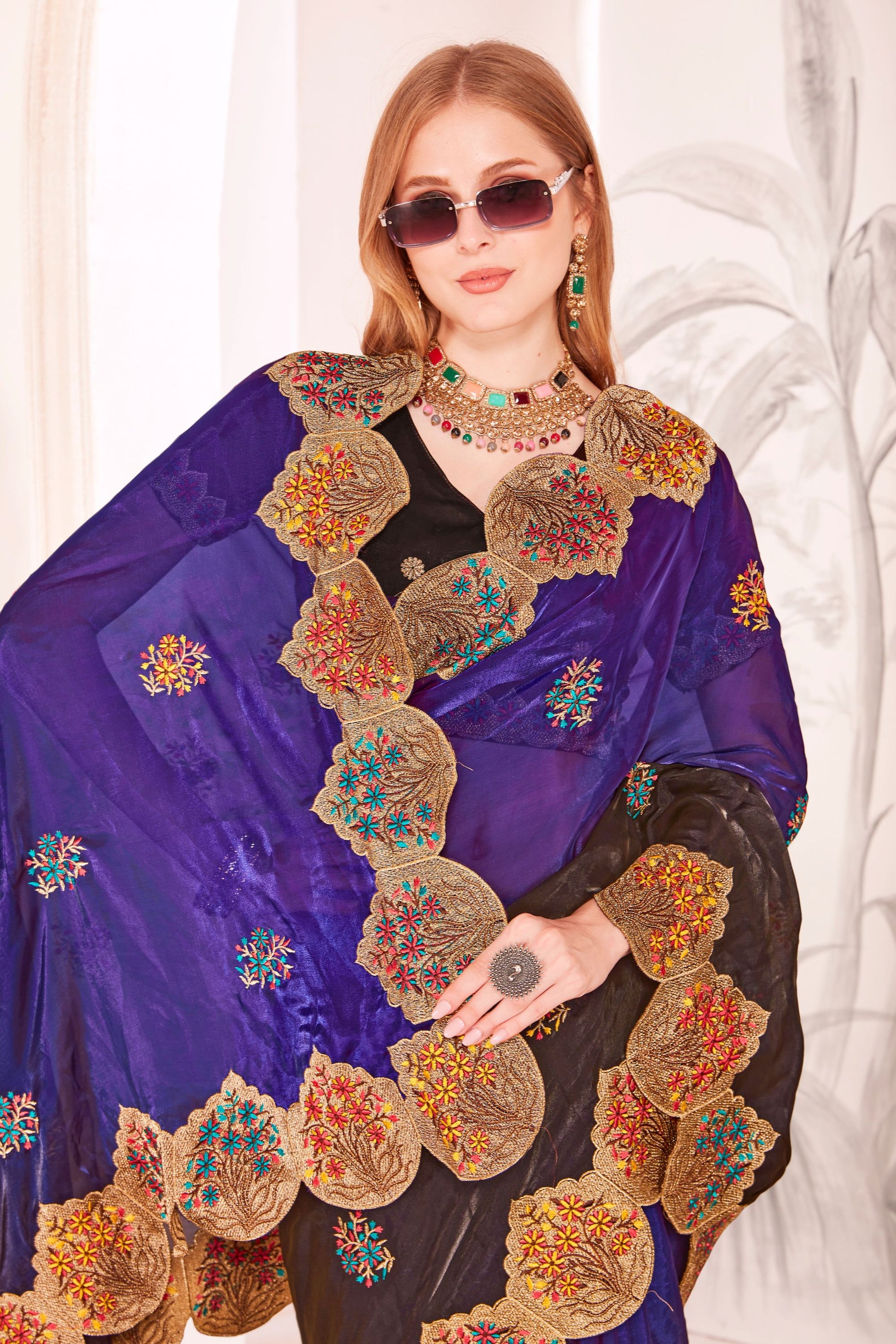 Designer Purple and Black Embroidered Silk Saree with Heavy Golden Border