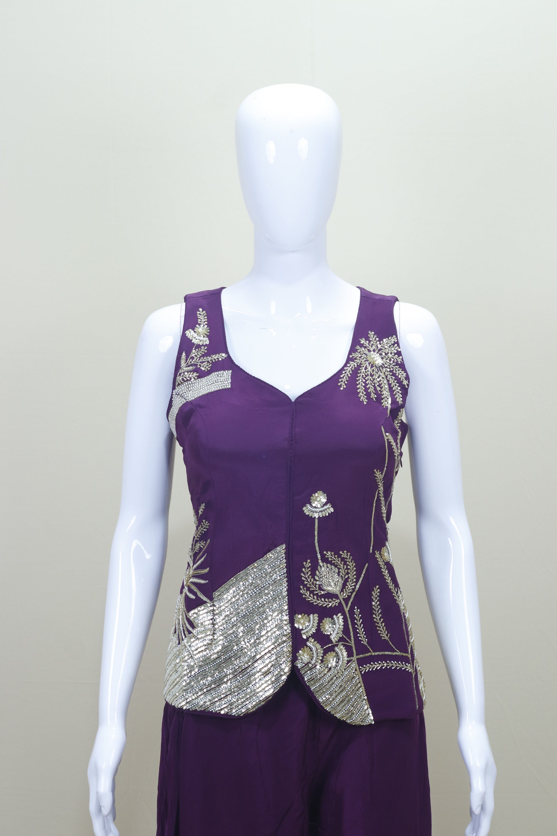 Elevate your ethnic wardrobe with this stunning Designer Purple Embroidered Party Wear Kurti with Palazzo Set Crafted from premium quality fabric, this outfit features intricate silver embroidery with sequin detailing that adds a touch of glamour. The sleeveless kurti with a stylish cut enhances your feminine charm, while the flowy palazzo pants ensure all-day comfort and elegance. Perfect for weddings, parties, festive occasions, and special gatherings, this party wear kurti with palazzo for women combines traditional craftsmanship with modern design. Pair it with statement jewelry and heels to complete the look.