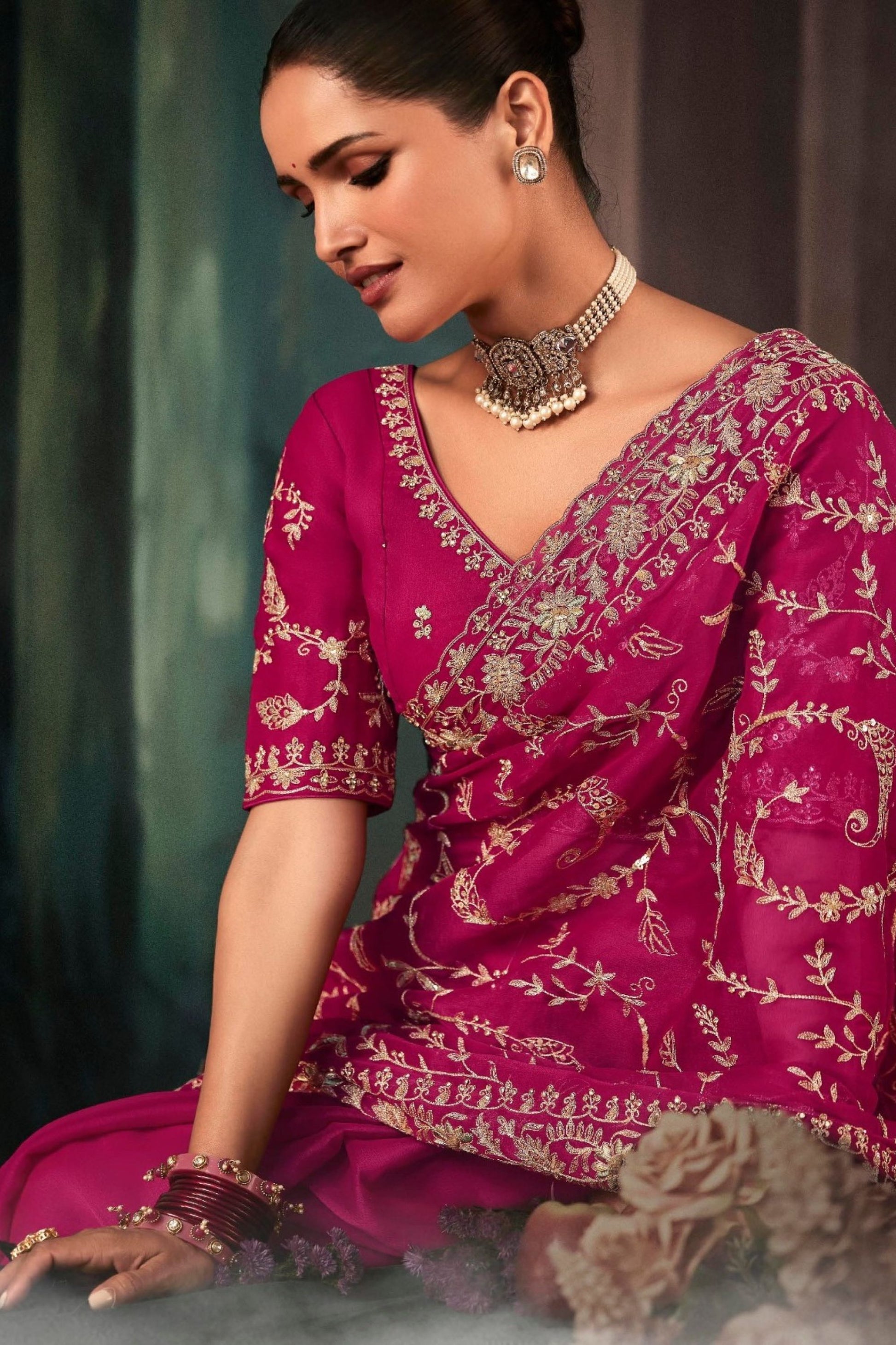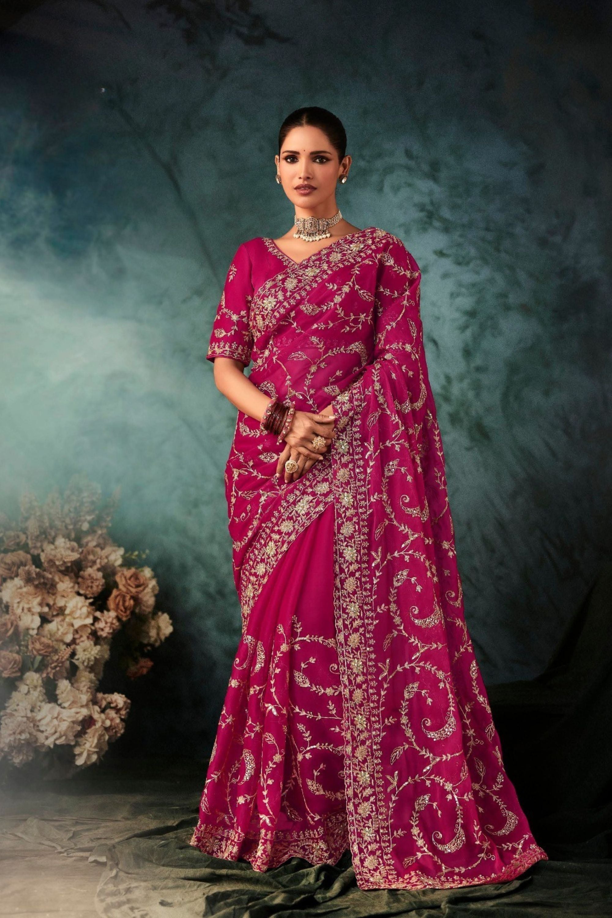 Elevate your festive and wedding wardrobe with this Designer Rani Pink Georgette Saree with Heavy Matching Blouse crafted to blend timeless elegance with modern sophistication. The rich magenta base is adorned with intricate golden zari embroidery, featuring delicate floral and vine motifs that add an opulent, royal charm to every drape. Made from premium-quality soft georgette fabric, the saree offers a graceful fall and lightweight comfort, making it perfect for long celebrations. The heavily embroidered border enhances the overall grandeur, while the matching designer blouse piece completes the ensemble for a flawless traditional look.