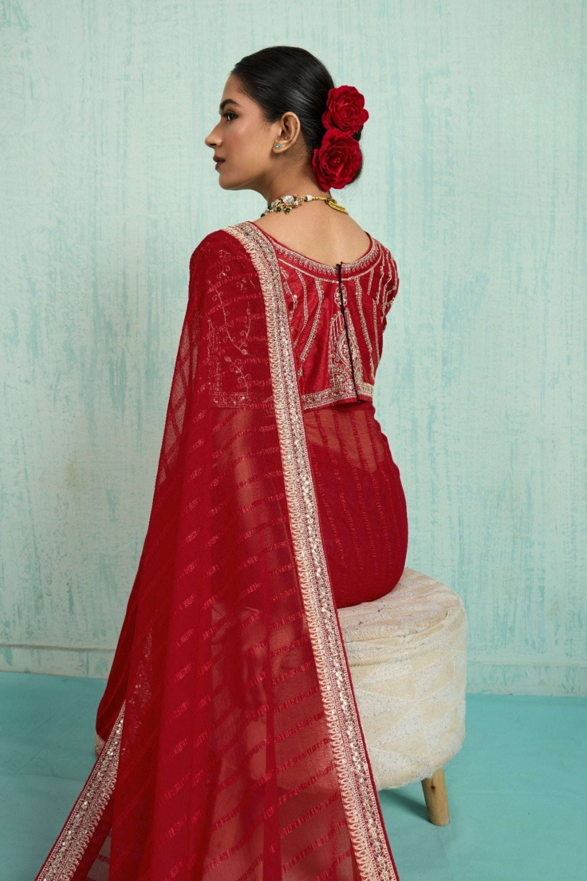 Turn heads with this Designer Red Georgette Saree Matching Blouse Party Wear a perfect blend of elegance and tradition. Crafted from premium georgette fabric, this saree features a delicate striped woven texture enhanced with a shimmering embroidered border. The highlight is its intricately designed blouse with rich embroidery, adding a royal charm to your ethnic attire. This red saree is an ideal choice for weddings, receptions, festive occasions, and parties, symbolizing grace and celebration. Its lightweight georgette drape ensures comfort while maintaining a luxurious look. Pair it with statement jewelry and heels to complete your glamorous festive outfit.