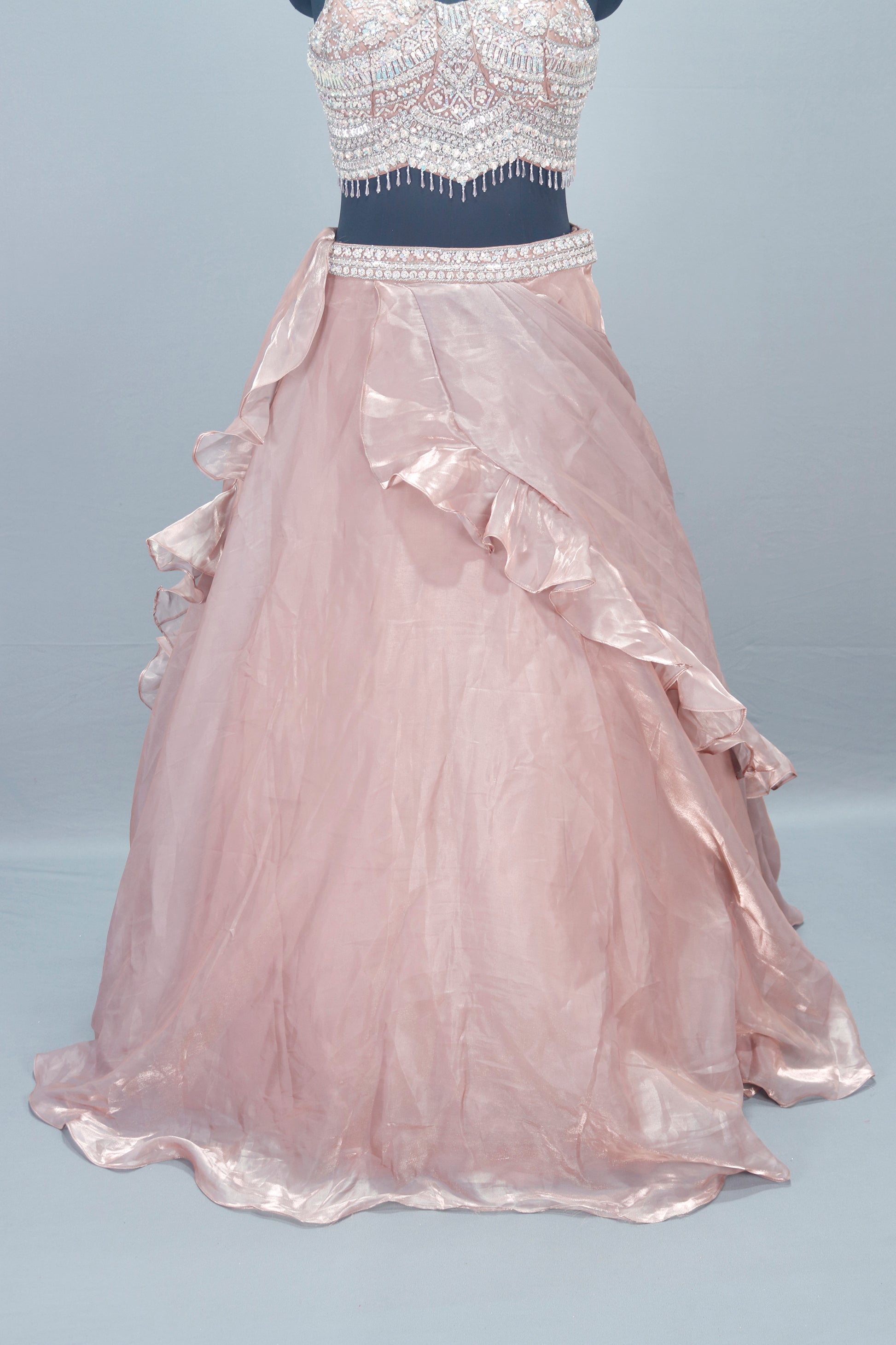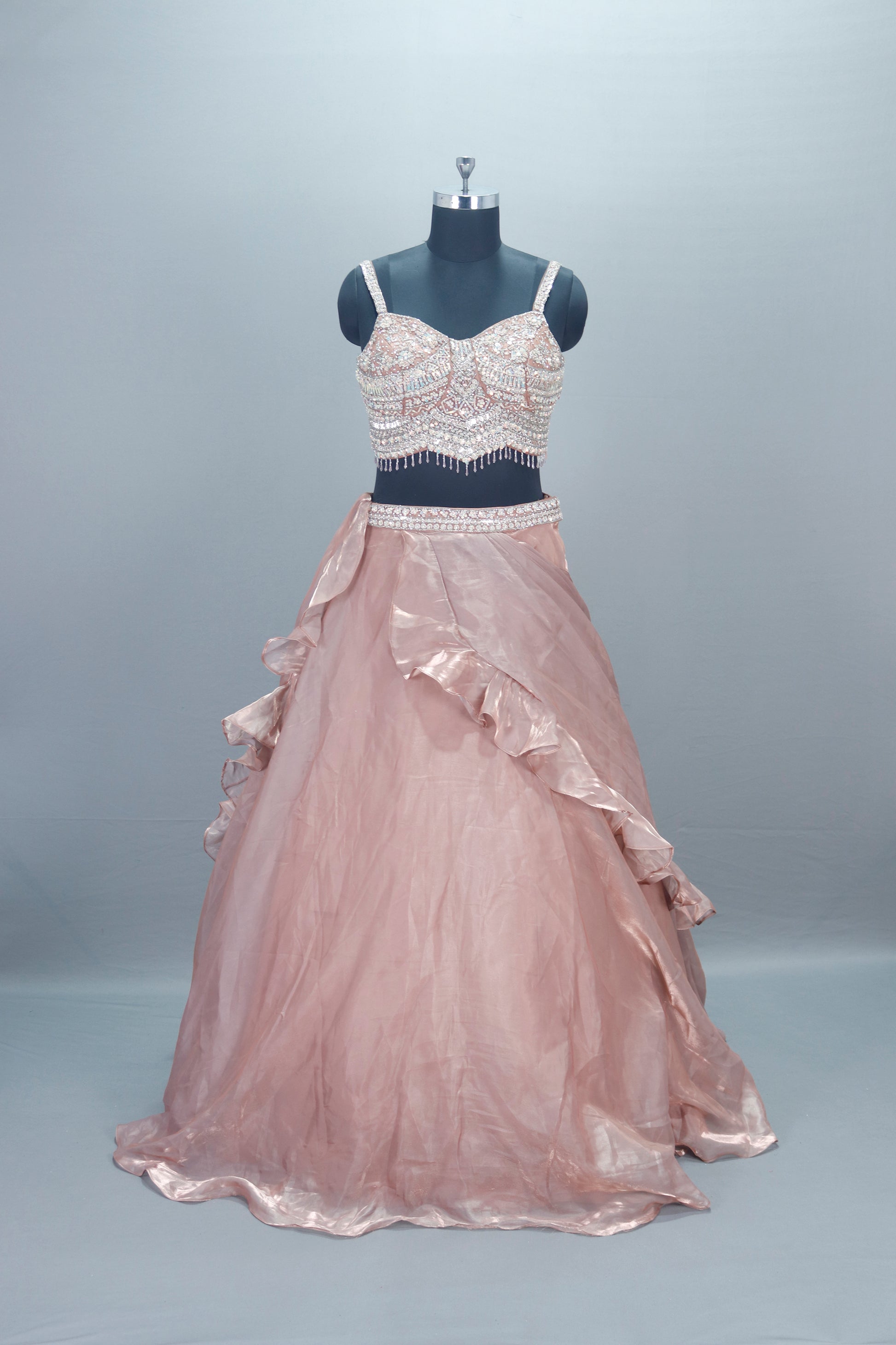 Elevate your ethnic wardrobe with this Designer Rose Gold Lehenga Choli Blouse and Sheer Cape Party Wear a perfect blend of elegance and modern charm. Crafted in premium fabric, the lehenga features a flowing silhouette with layered ruffles for a regal look. The heavily embroidered blouse with intricate beadwork and sequins adds a touch of glamour, while the stylish sheer cape with delicate embellishments creates a contemporary twist on traditional wear. Ideal for weddings, receptions, sangeet, parties, and festive occasions, this rose gold lehenga choli is designed to make you the center of attention. Pair it with statement jewelry and heels for a complete designer look.