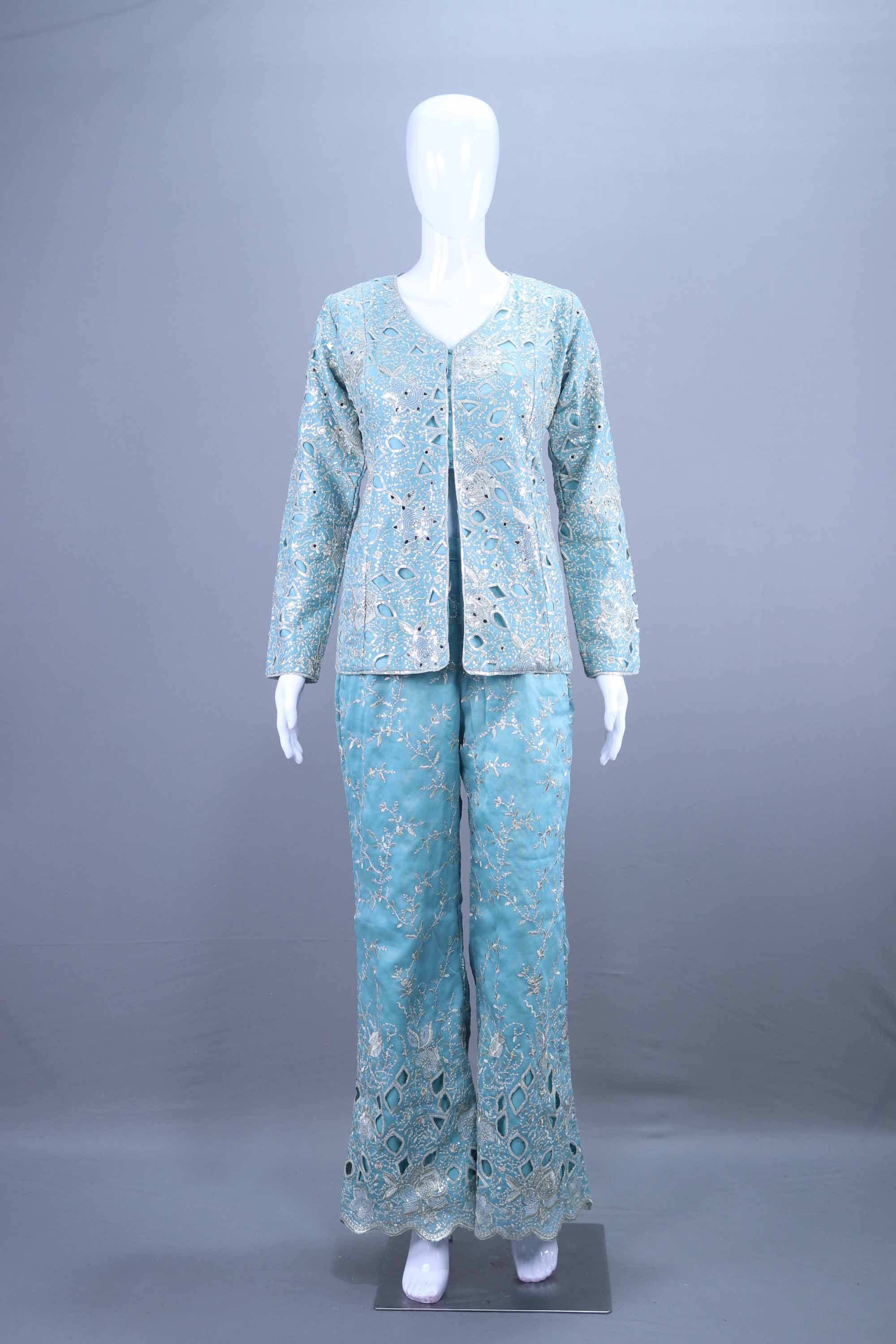 Elegant Aqua Blue Embroidered Jacket Pant Set for Festive Wear