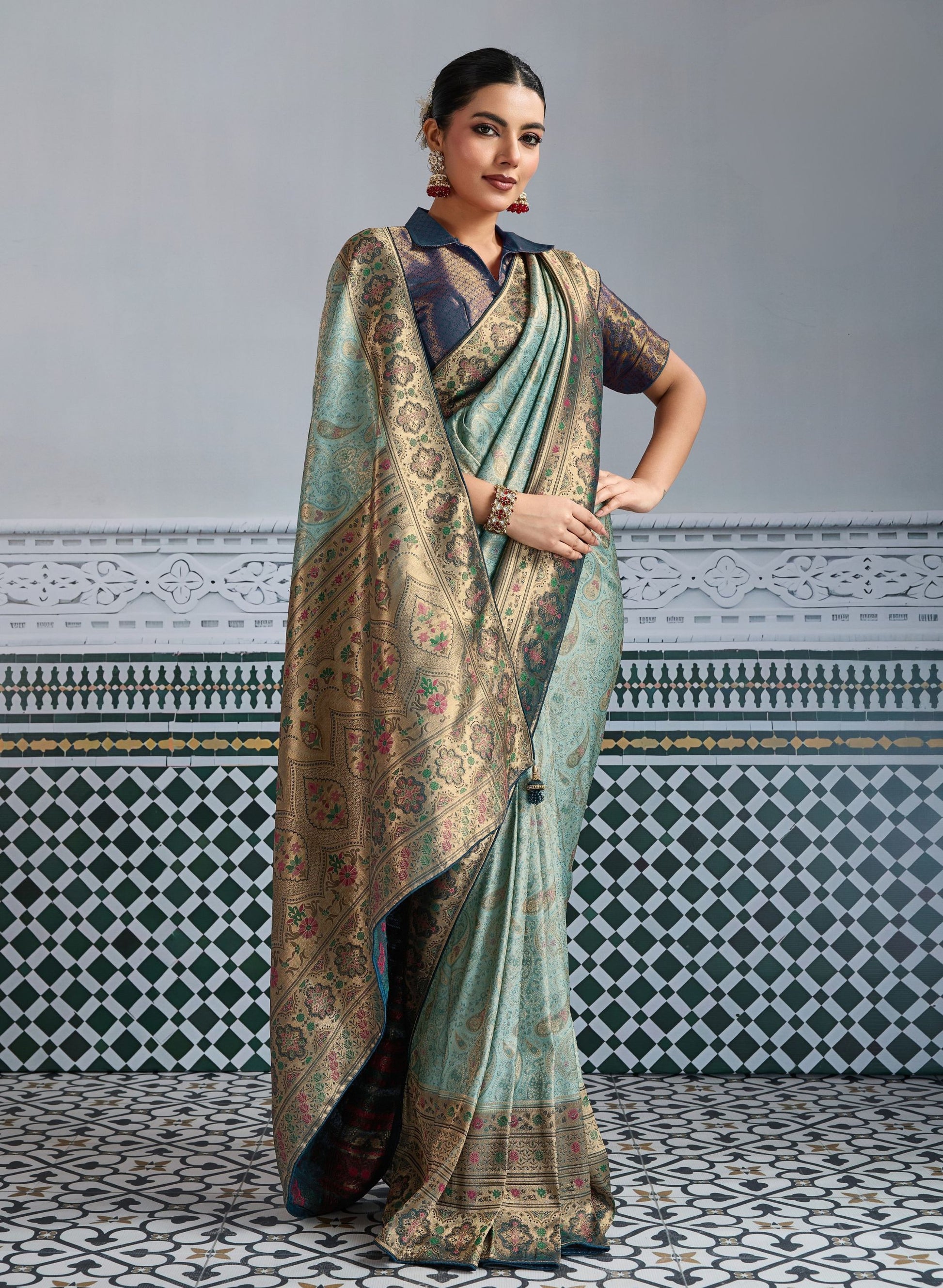 Elegant Banarasi Silk Saree in Sea Green with Contrasting Navy Blue Blouse