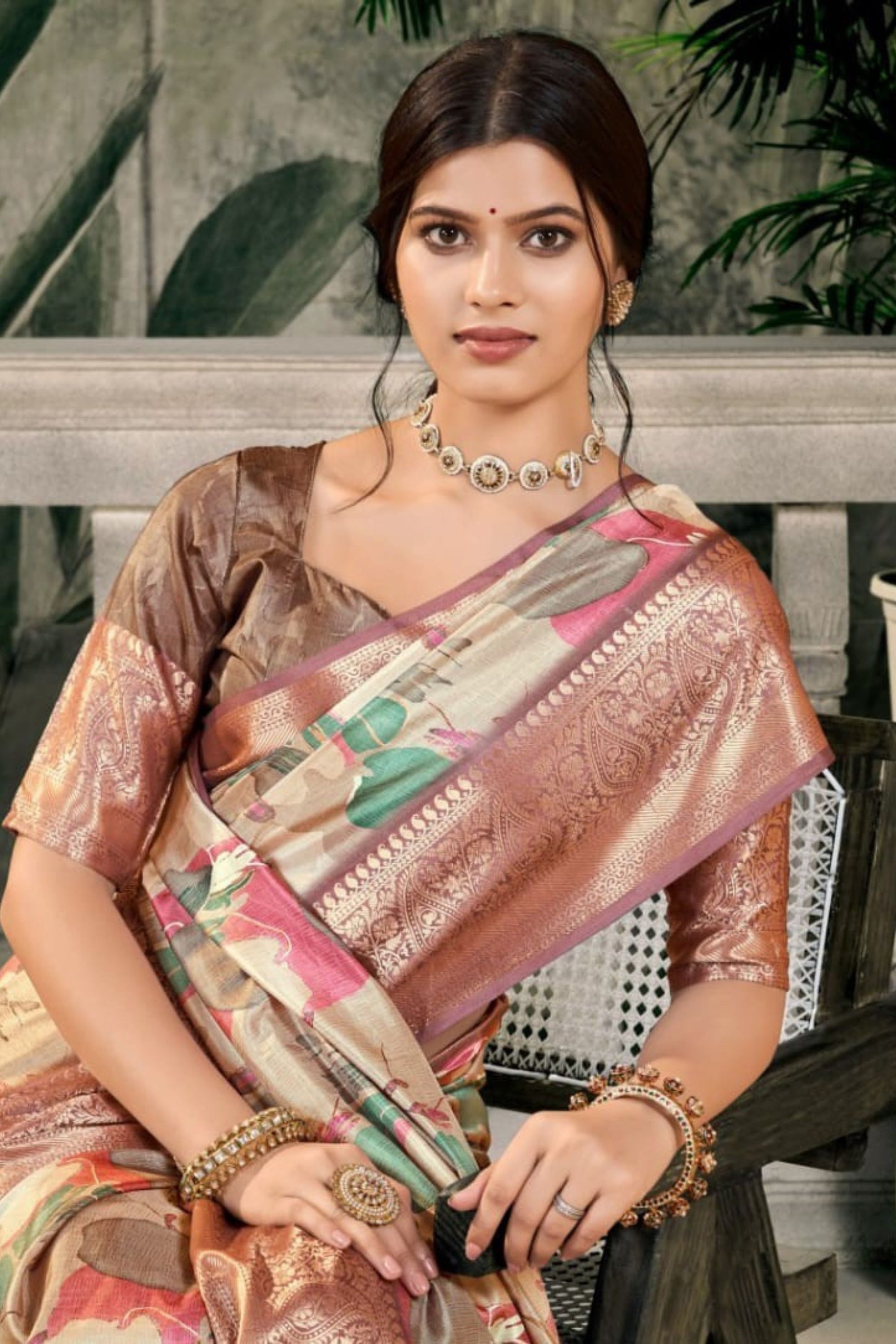 Add a touch of royalty to your ethnic wardrobe with this Elegant Beige Banarasi Silk Saree Wedding Festive Wear featuring exquisite floral prints and a beautifully woven zari border. Crafted from premium silk, this saree offers a perfect blend of traditional charm and modern sophistication. The rich zari detailing along with multi-color floral motifs enhances its timeless appeal, making it an ideal choice for weddings, festive celebrations, parties, and traditional occasions.