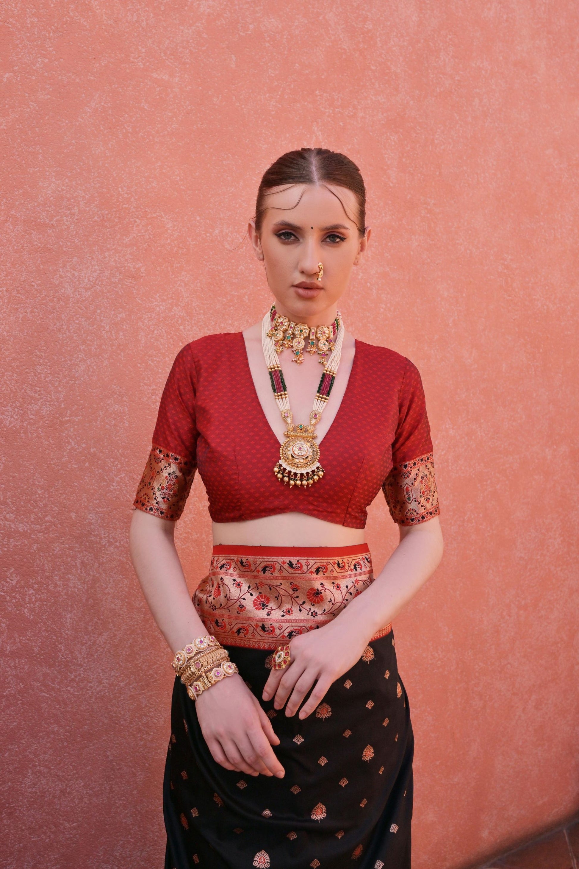 Elevate your festive and wedding wardrobe with this Elegant Black Red Banarasi Silk Saree with Rich Golden Zari Border , beautifully adorned with intricate zari weaving. The rich black body features delicate butti motifs, while the vibrant red border and pallu showcase traditional floral and paisley patterns, adding a royal touch to your ensemble. Paired with a contrasting red blouse featuring luxurious golden detailing, this saree is the perfect blend of elegance and tradition. Crafted from high-quality silk with a lustrous finish, it offers a graceful drape suitable for weddings, receptions, festivals, and cultural celebrations. The timeless design, paired with exquisite craftsmanship, makes it a must-have for women who love classic Indian ethnic wear with a modern edge.