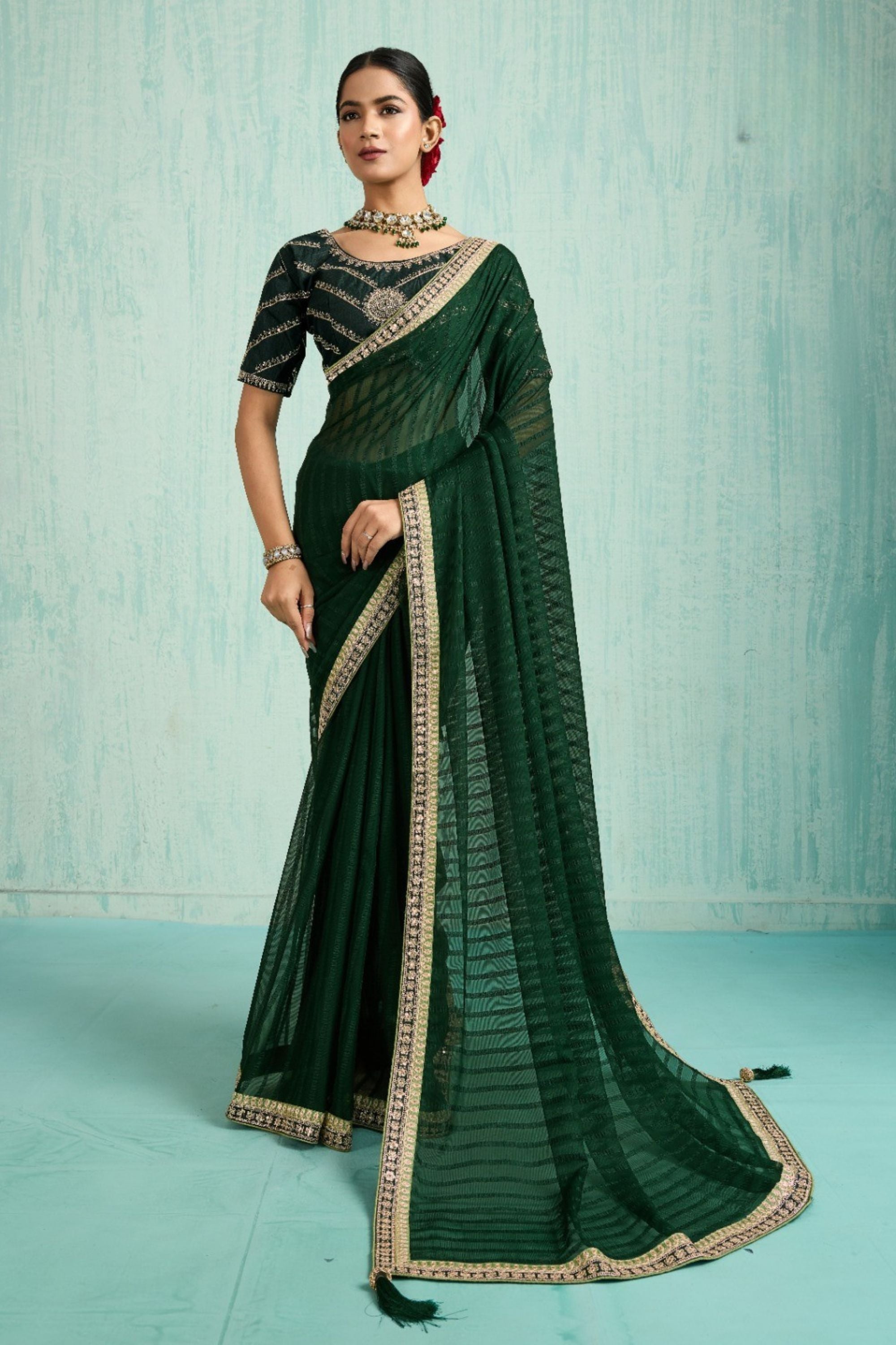 Turn heads with this Elegant Dark Green Net Saree Designer Blouse featuring a stunning golden embellished border and a designer matching blouse. Crafted from premium net fabric, this saree combines sheer grace with modern charm, making it the perfect choice for weddings, receptions, festive occasions, and parties. The lightweight drape ensures all-day comfort, while the shimmering golden embroidery on the border adds a royal touch. Paired with a stylish designer blouse, this saree exudes sophistication and glamour. Whether you’re the bride, bridesmaid, or a guest, this saree will elevate your ethnic style effortlessly.
