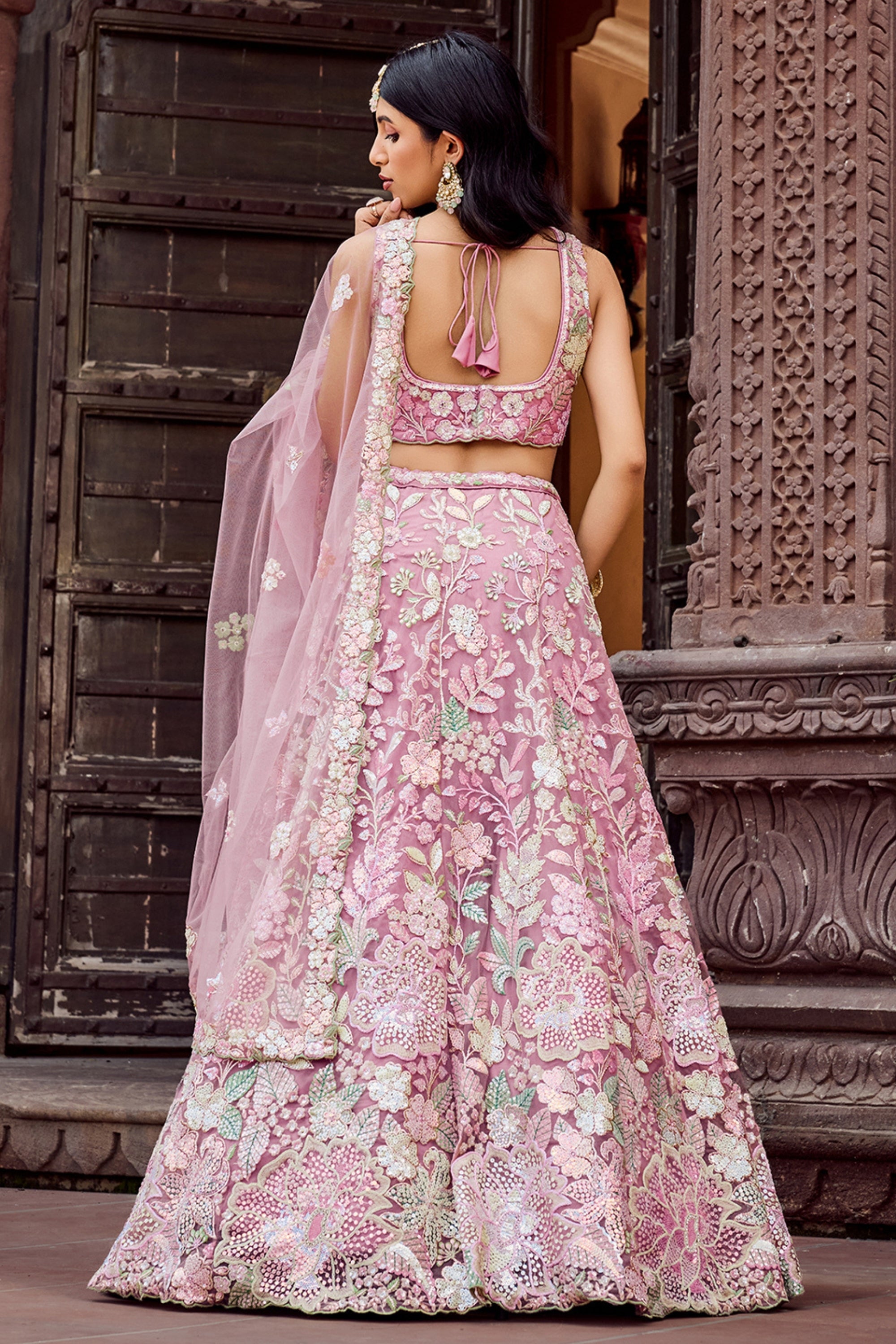 Elegant Dusty Pink Net Embroidered Wedding Lehenga Choli with Floral Sequins Work