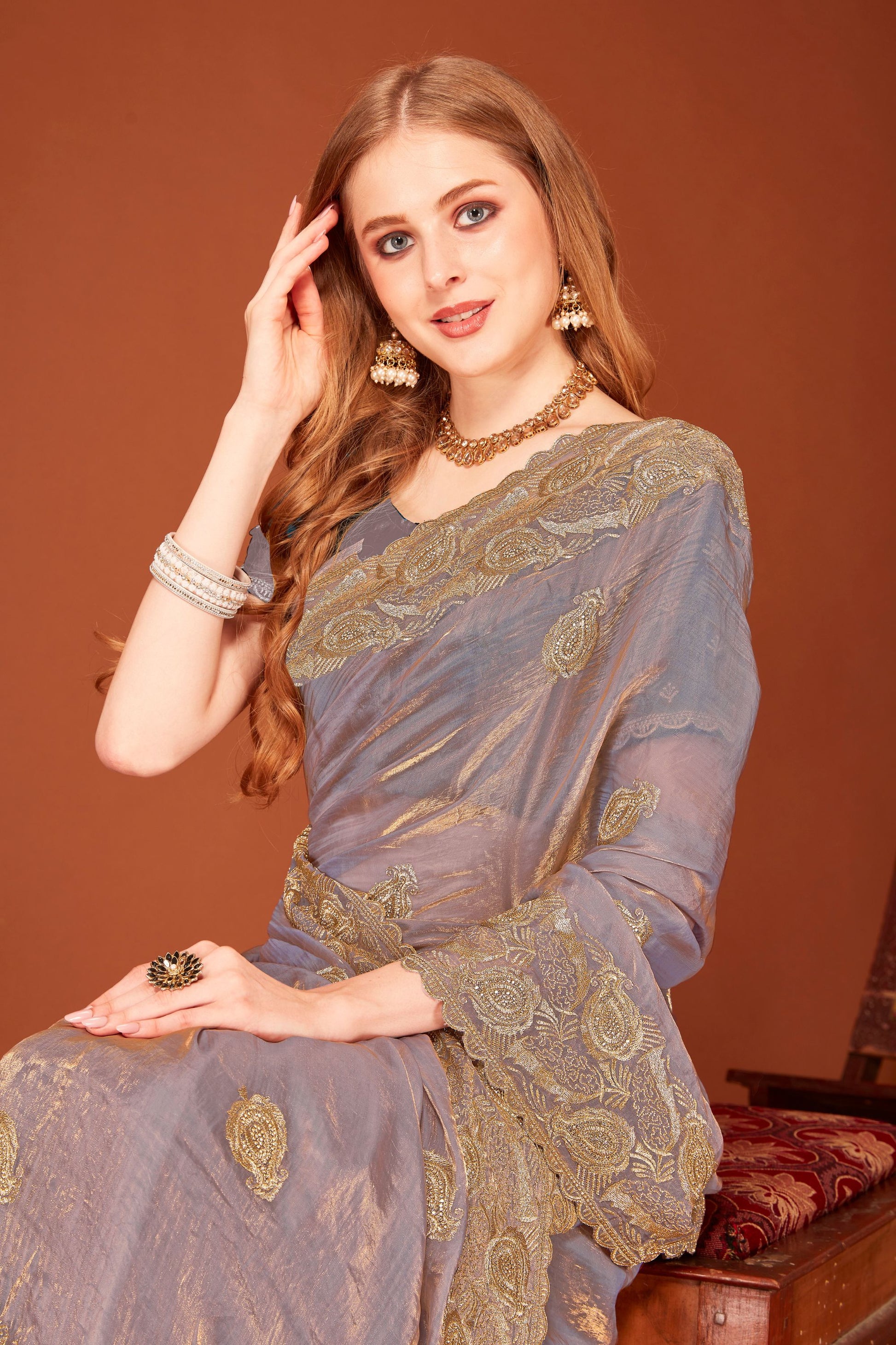 Add timeless elegance to your wardrobe with this Elegant Grey Organza Saree Party Wear Wedding Saree Crafted from premium lightweight organza fabric, this saree offers a perfect blend of sophistication and comfort. The detailed golden thread work enhances its royal appeal, making it an ideal choice for weddings, festive occasions, parties, and receptions. Pair it with statement jewelry and heels for a complete traditional look. Designed for modern women who love classic ethnic wear, this saree is sure to turn heads wherever you go.