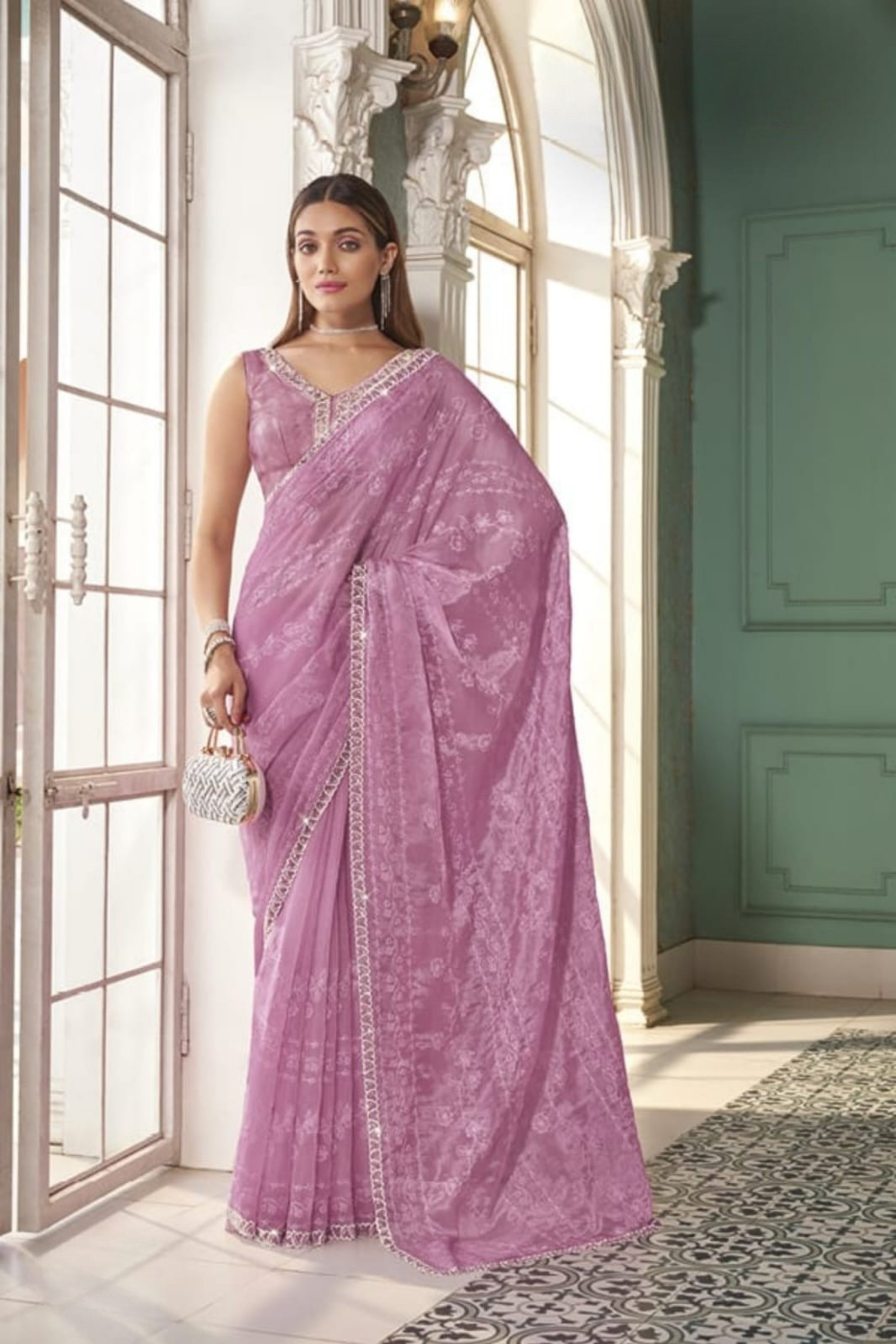 Elegant Lavender Net Embroidered Saree with Matching Blouse for Wedding Party Wear