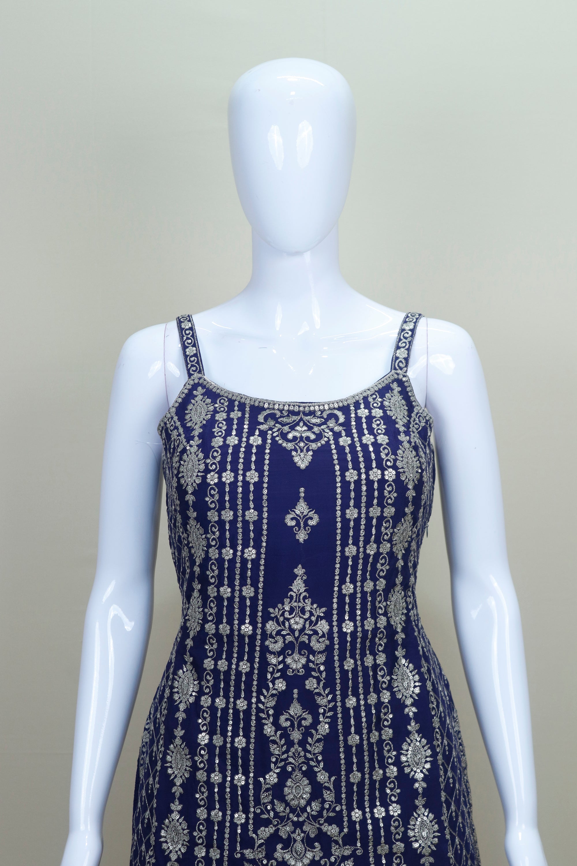 Step into elegance with this stunning Elegant Navy Blue Sharara Suit with Dupatta Party Wedding Wear designed for women who love traditional charm with a modern touch. Crafted from premium fabric, this sharara suit features intricate silver thread embroidery on the kurta, paired with a flowy sharara bottom and a beautifully bordered net dupatta. Perfect for weddings, festive celebrations, parties, and receptions, this ethnic set ensures you stand out in style. Whether you’re the bride’s sister, bridesmaid, or a wedding guest, this designer sharara suit is a must-have addition to your festive wardrobe. Its rich navy blue hue with delicate detailing gives you a regal and graceful look for any special occasion.