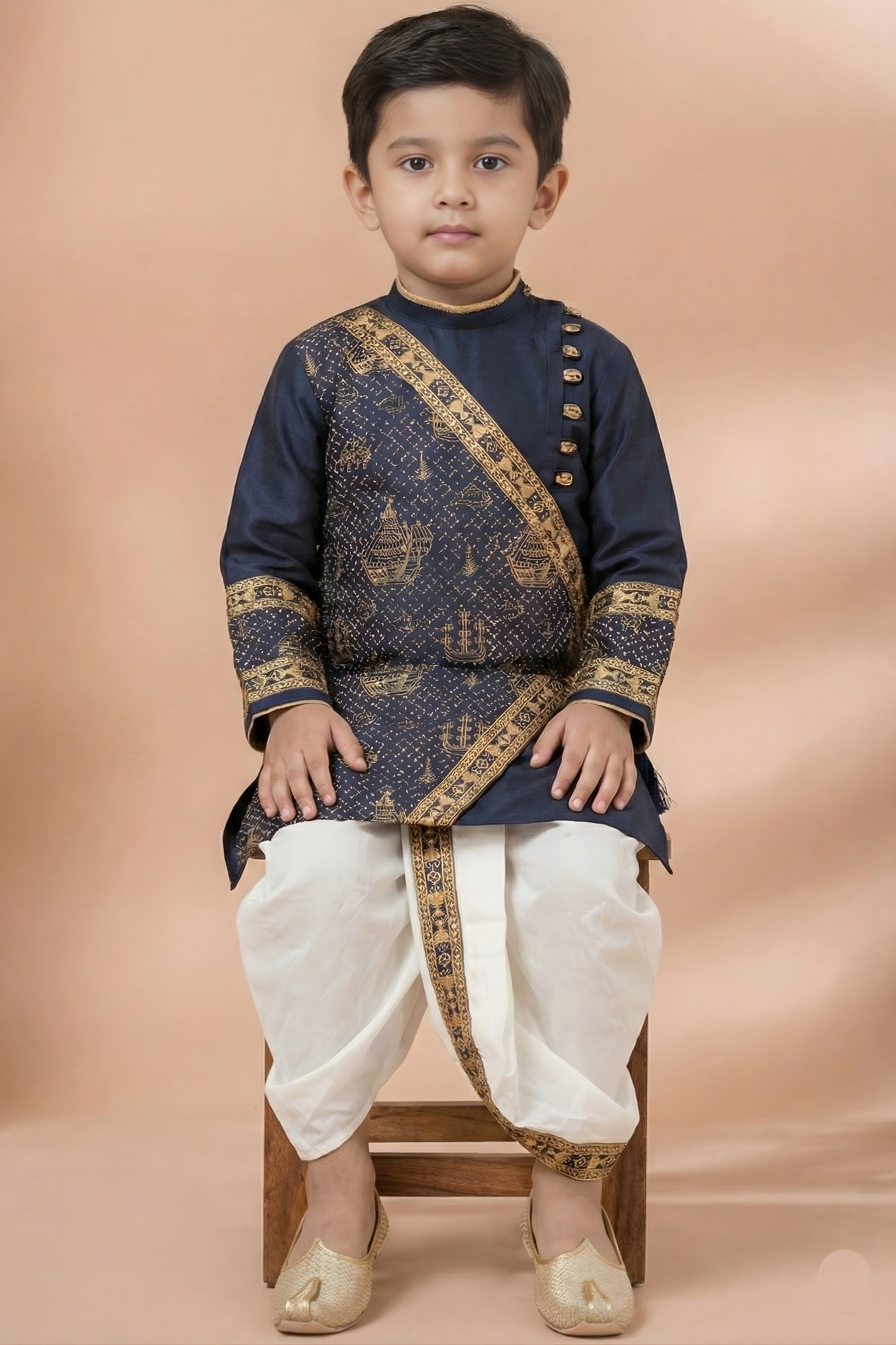 Elegant Navy Blue Viscose Embroidered Kurta Dhoti Set with Golden Motifs For Kid