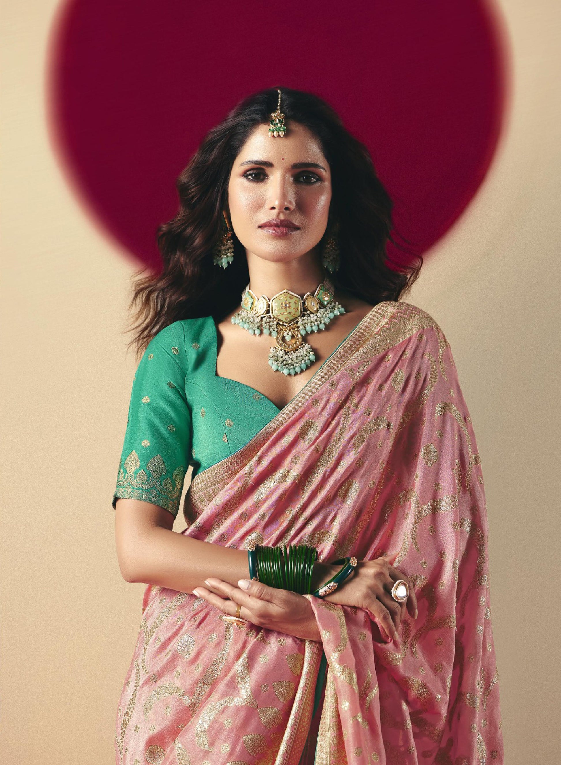 Bring out your royal charm with this Elegant Pink Banarasi Silk Saree Festive Wear Saree a masterpiece of traditional Indian craftsmanship. Made from premium silk fabric, this saree is adorned with delicate floral and paisley motifs in rich golden zari, making it a timeless attire for grand celebrations. The soothing pink shade paired with the intricate zari detailing gives it a graceful yet festive look, making it perfect for weddings, bridal trousseau, receptions, pujas, and festive occasions. This saree is paired with an unstitched matching blouse piece, allowing you to personalize your style.