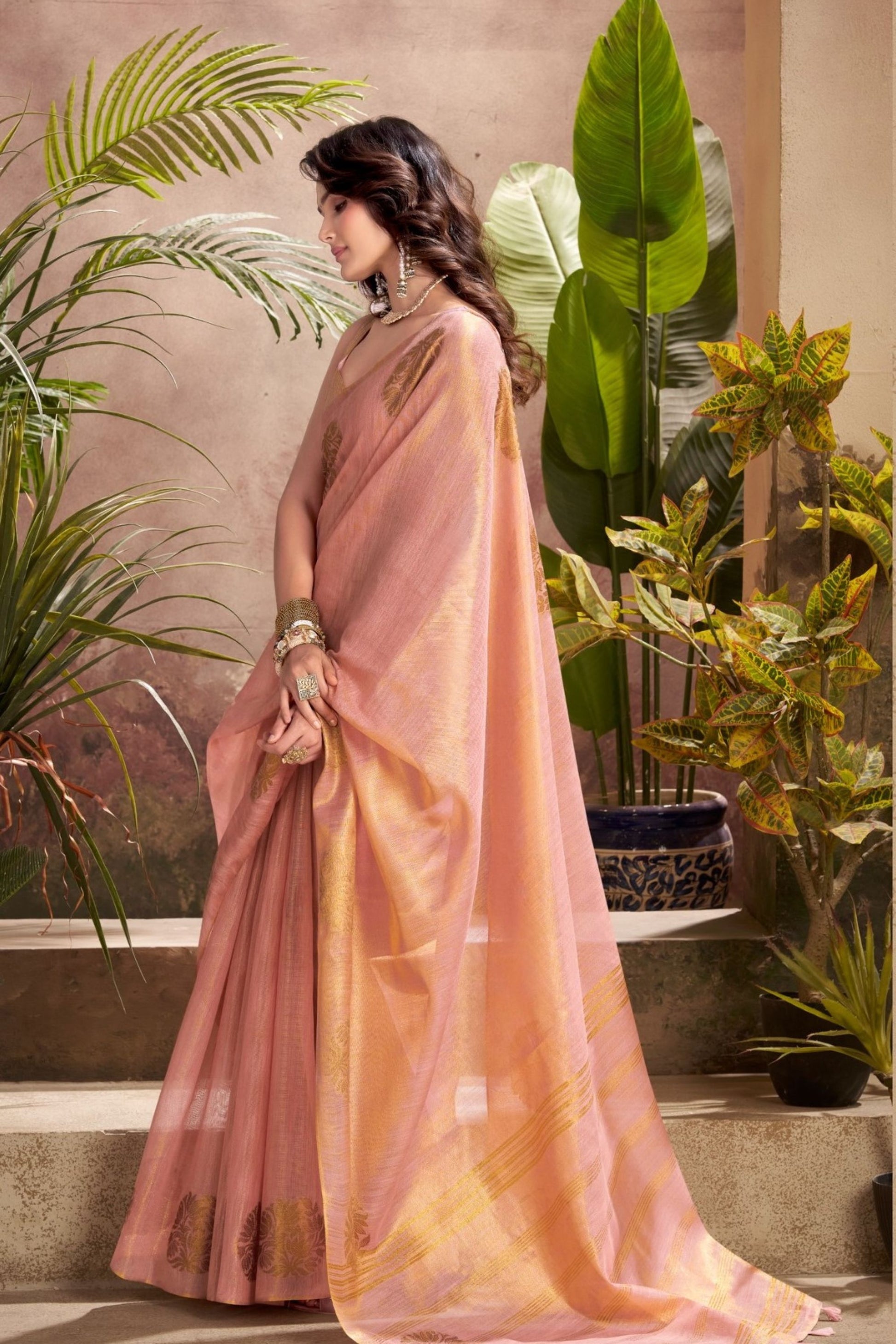 Elevate your ethnic charm with this Elegant Pink Banarasi Silk Saree with Golden Zari  Festive Wear, designed to bring timeless grace to your festive and wedding look. Crafted from premium quality silk, this saree showcases intricate golden zari motifs and a beautifully woven pallu that reflects traditional Banarasi artistry. Perfect for weddings, festivals, parties, and special occasions, this saree combines comfort with luxurious appeal. Style it with traditional jewelry and heels to create a regal ensemble that turns every head.