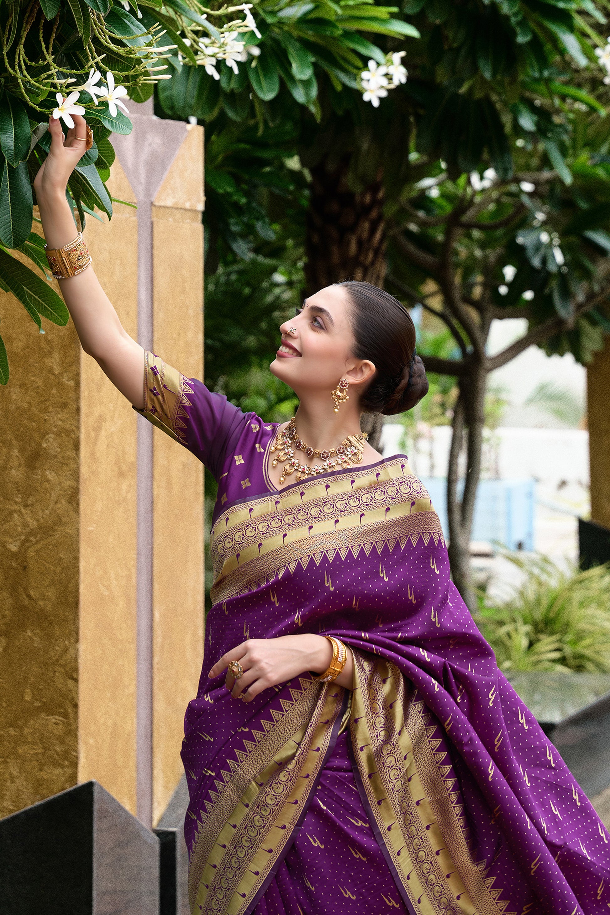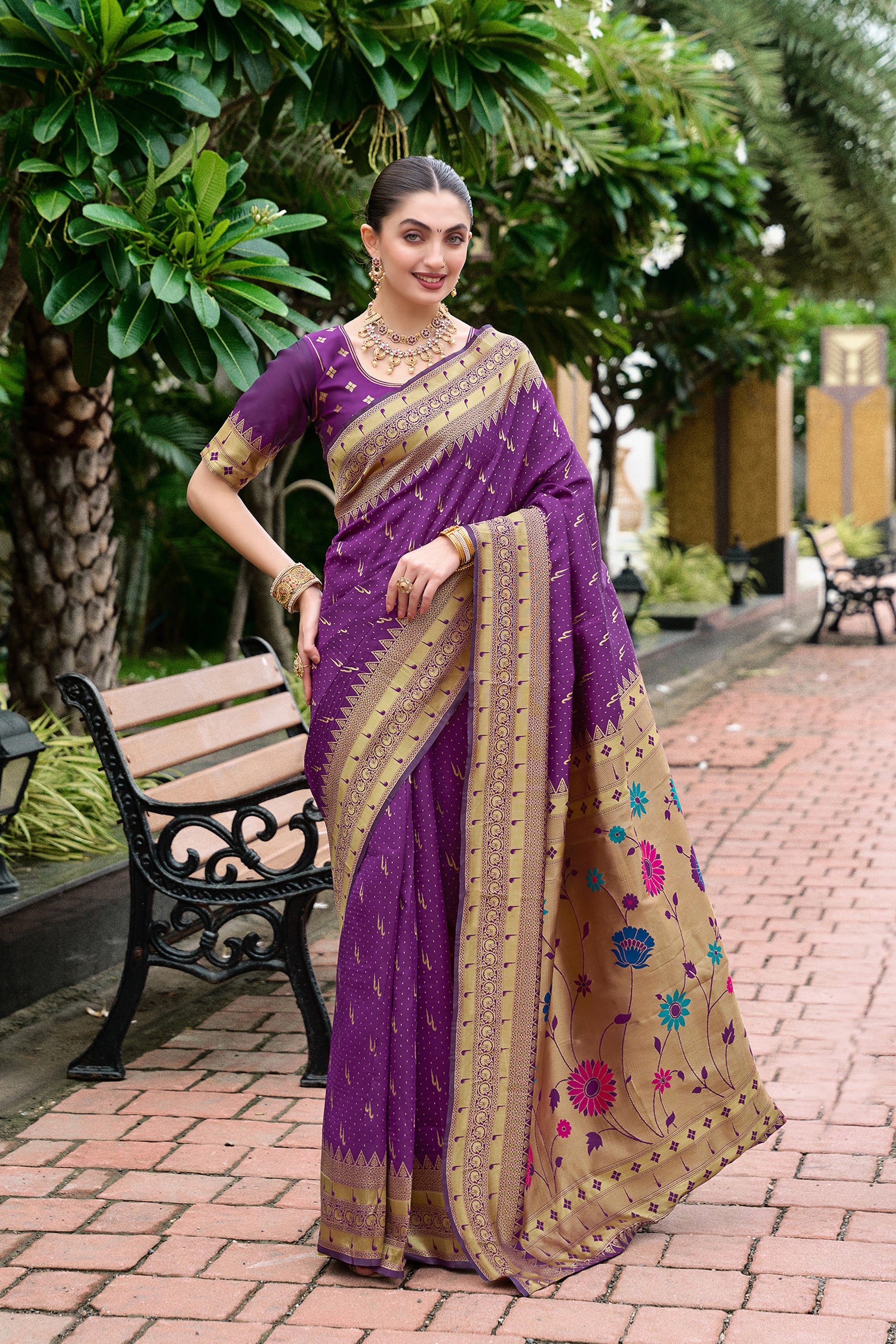 Enhance your ethnic wardrobe with this Elegant Purple Banarasi Silk Saree Floral Design featuring a rich golden zari border and intricate woven motifs. The pallu is adorned with vibrant floral patterns in pink and turquoise, adding a touch of grace and tradition. Crafted from premium quality silk, this saree offers a luxurious drape and a timeless appeal, perfect for weddings, festive occasions, parties, and cultural celebrations. Pair it with traditional jewelry to create a stunning ethnic look.