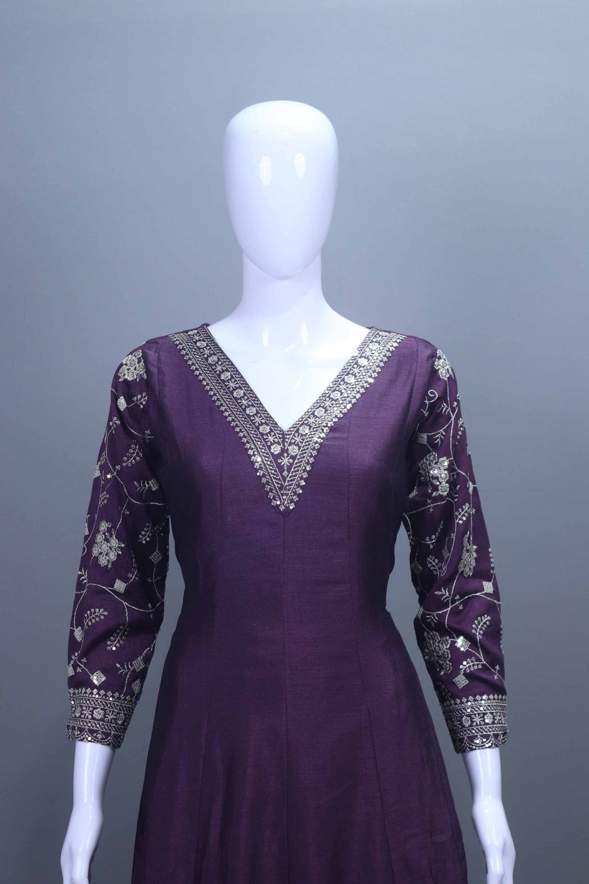 Enhance your ethnic charm with this Elegant Purple Silk Anarkali Suit Dupatta Traditional Party Wear, a perfect blend of tradition and sophistication. Crafted from premium silk fabric, this outfit features intricate zari and thread embroidery on the neckline, sleeves, and hemline, creating a luxurious festive look. The matching embroidered dupatta adds grace and completes the ensemble, making it ideal for weddings, festive celebrations, and traditional occasions.