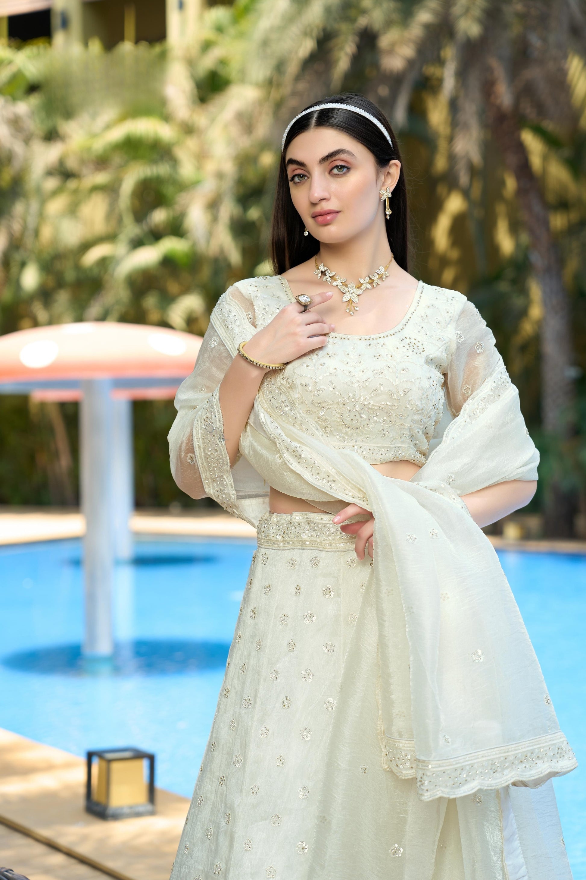 Step into timeless elegance with this White Embroidered Organza Lehenga Choli with Dupatta, perfect for weddings, receptions, festive occasions, and parties. Crafted from premium net fabric, the lehenga is adorned with delicate floral embroidery, sequins, and lacework for a luxurious finish. The matching embroidered blouse adds a sophisticated touch, while the soft net dupatta completes the ensemble with effortless grace. Designed for comfort and style, this lehenga choli is ideal for bridesmaids, festive celebrations, and special events where you want to make a lasting impression.