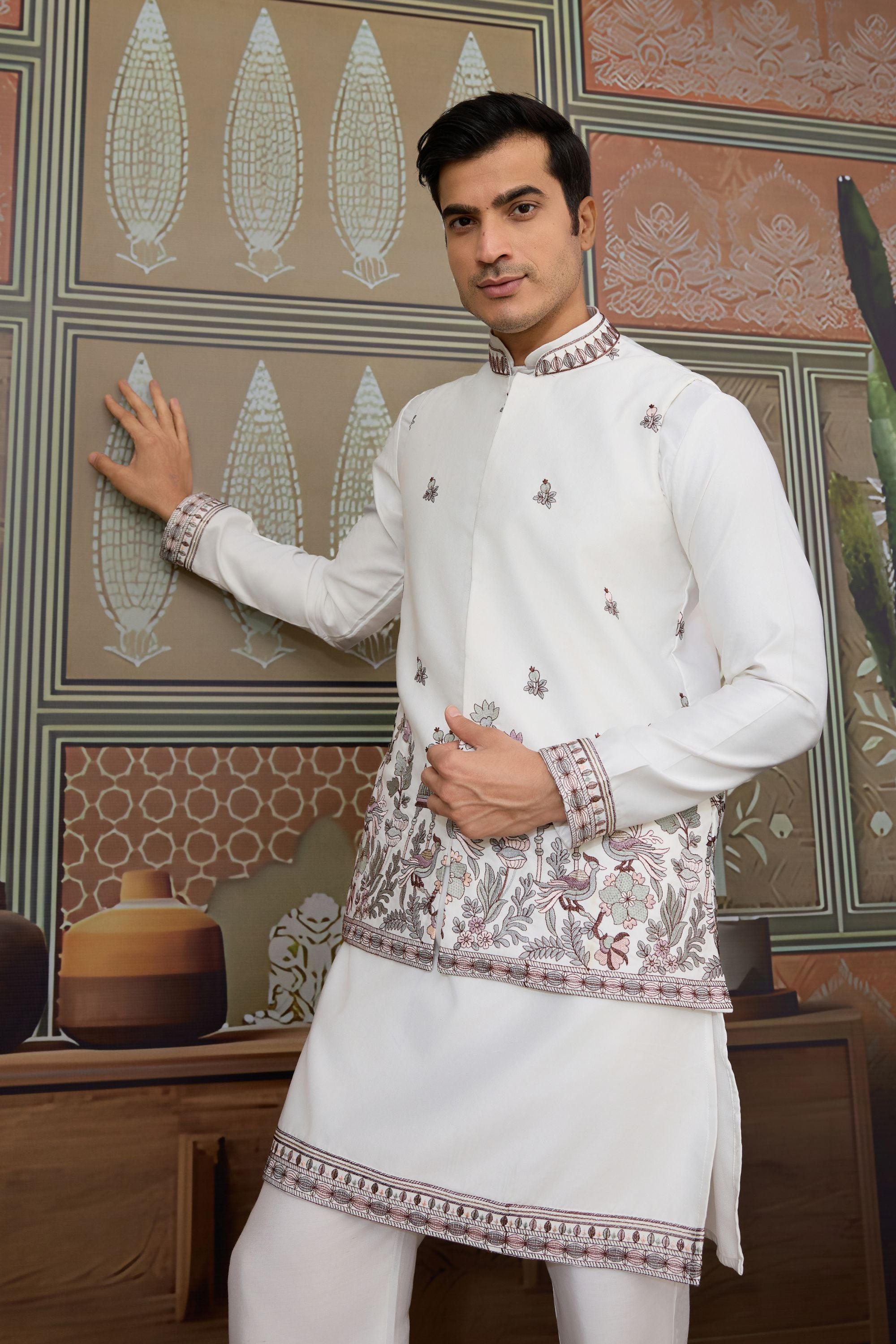 Elevate your festive and wedding look with this Elegant White Silk Embroidered Indo Western Kurta Pyjama Set with Jacket. Crafted from premium fabric, this outfit features delicate thread embroidery on the collar, cuffs, and hemline, adding a royal touch to its subtle elegance. The Indo Western silhouette offers a perfect blend of traditional charm and modern sophistication. Paired with a matching churidar, this ensemble is ideal for weddings, receptions, festive occasions, and cultural events.